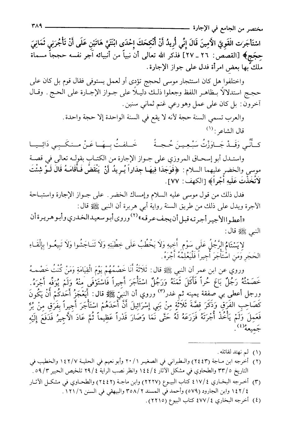 فَدَلَّ ذَلِكَ مِنْ قَوْلِ مُوسَى عَلَيْهِ السَّلَامُ وَإِمْسَاكِ الْخَضِرِ. عَلَى جَوَازِ الْإِجَارَةِ وَاسْتِبَاحَةِ الْأُجْرَةِ وَيَدُلُّ عَلَى ذَلِكَ مِنْ طَرِيقِ السُّنَّةِ رِوَايَةُ أَبِي هُرَيْرَةَ أَنَّ النَّبِيَّ - صَلَّى اللَّهُ عَلَيْهِ وَسَلَّم َ - قَالَ: " أَعْطُوا الْأَجِيرَ أُجْرَتَهُ قَبْلَ أَنْ يَجِفَّ عَرَقُهُ " وَرَوَى أَبُو سَعِيدٍ الْخُدْرِيُّ وَأَبُو هُرَيْرَةَ أَنَّ النَّبِيَّ - صَلَّى اللَّهُ عَلَيْهِ وَسَلَّم َ - قَالَ: لَا يَسْتَامُ الرَّجُلُ عَلَى سَوْمِ أَخِيهِ وَلَا يَخْطُبُ عَلَى خِطْبَتِهِ وَلَا تَنَاجَشُوا وَلَا تَبِيعُوا بِإِلْقَاءِ الْحَجَرِ وَمَنِ اسْتَأْجَرَ أَجِيرًا فَلْيُعْلِمْهُ أَجْرَهُ.