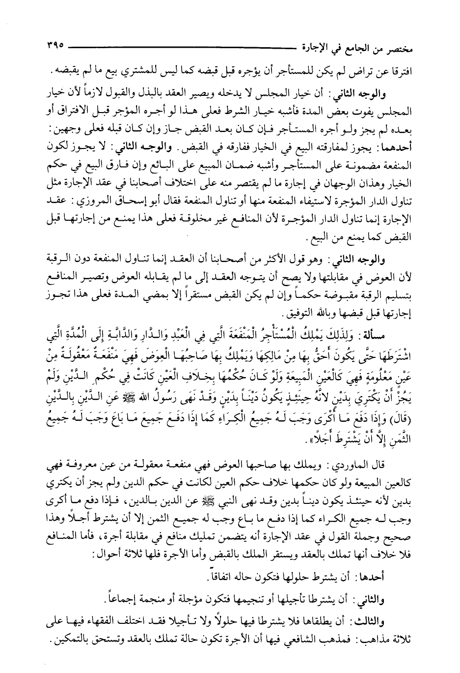 وَالْوَجْهُ الثَّانِي: وَهُوَ قَوْلُ الْأَكْثَرِ مِنْ أَصْحَابِنَا إِنَّ الْعَقْدَ إِنَّمَا تَنَاوَلَ الْمَنْفَعَةَ دُونَ الرَّقَبَةِ لِأَنَّ الْعِوَضَ فِي مُقَابَلَتِهَا وَلَا يَصِحُّ أَنْ يَتَوَجَّهَ الْعَقْدُ إِلَى مَا لَمْ يُقَابِلْهُ الْعِوَضُ وَتَصِيرَ الْمَنَافِعُ بِتَسْلِيمِ الرَّقَبَةِ مَقْبُوضَةً حُكْمًا وَإِنْ لَمْ يَكُنِ الْقَبْضُ مُسْتَقِرًّا إِلَّا بِمُضِيِّ الْمُدَّةِ فَعَلَى هَذَا تَجُوزُ إِجَارَتُهَا قَبْلَ قَبْضِهَا وَبِاللَّهِ التوفيق.