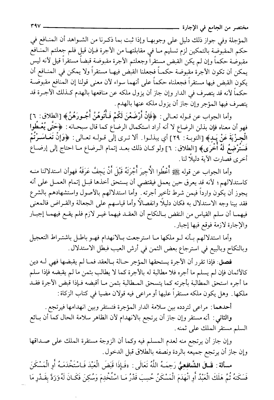 الْمُؤَجَّلَةِ وَفِي جَوَازِ ذَلِكَ دَلِيلٌ عَلَى وُجُوبِهَا وَإِذَا ثَبَتَ بِمَا ذَكَرْنَا مِنَ الشَّوَاهِدِ أَنَّ الْمَنَافِعَ فِي حُكْمِ الْمَقْبُوضَةِ بِالتَّمْكِينِ لَزِمَ تَسْلِيمُ مَا فِي مُقَابَلَتِهَا مِنَ الْأُجْرَةِ فَإِنْ قِيلَ فَلِمَ جَعَلْتُمُ الْمَنَافِعَ مَقْبُوضَةً حُكْمًا وَإِنْ لَمْ يكن القبض مُسْتَقِرًّا وَجَعَلْتُمُ الْأُجْرَةَ مَقْبُوضَةً قَبْضًا مُسْتَقِرًّا قِيلَ لِأَنَّهُ لَيْسَ يُمْكِنُ أَنْ تَكُونَ الْأُجْرَةُ مَقْبُوضَةً حُكْمًا فَجَعَلْنَا الْقَبْضَ فِيهَا مُسْتَقِرًّا وَلَا يُمْكِنُ فِي الْمَنَافِعِ أَنْ يَكُونَ الْقَبْضُ فِيهَا مُسْتَقِرًّا فَجَعَلْنَاهُ حُكْمًا عَلَى أَنَّهُمَا سَوَاءٌ لِأَنَّ مَعْنَى قَوْلِنَا إِنَّ الْمَنَافِعَ مَقْبُوضَةٌ حُكْمًا لِأَنَّهُ قَدْ يَتَصَرَّفُ فِي الدَّارِ وَإِنْ جَازَ أَنْ يَزُولَ مِلْكُهُ عَنْ مَنَافِعِهَا بِالْهَدْمِ كَذَلِكَ الْأُجْرَةُ قَدْ يَتَصَرَّفُ فِيهَا الْمُؤَجِّرُ وَإِنْ جَازَ أَنْ يَزُولَ مِلْكُهُ عَنْهَا بِالْهَدْمِ.