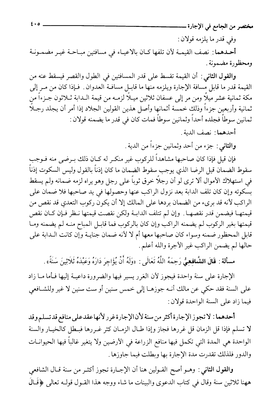 أَحَدُهُمَا: لَا تَجُوزُ الْإِجَارَةُ أَكْثَرَ مِنْ سَنَةٍ لِأَنَّ الْإِجَارَةَ غَرَرٌ لِأَنَّهَا عَقْدٌ عَلَى مَنَافِعَ قَدْ تُسَلَّمُ وَقَدْ لَا تُسَلَّمُ فَإِذَا قَلَّ الزَّمَانُ قَلَّ غَرَرُهَا فَجَازَ وَإِذَا طَالَ الزَّمَانُ كَثُرَ غَرَرُهَا فَبَطَلَ كَالْخِيَارِ وَالسَّنَةُ الْوَاحِدَةُ هِيَ الْمُدَّةُ الَّتِي تَكْمُلُ فِيهَا مَنَافِعُ الزِّرَاعَةِ فِي الْأَرَضِينَ وَلَا يَتَغَيَّرُ غَالِبًا فِيهَا الْحَيَوَانَاتُ وَالدُّورُ فَلِذَلِكَ تَقَدَّرَتْ مُدَّةُ الْإِجَارَةِ بِهَا وَبَطَلَتْ فِيمَا جَاوَزَهَا.
