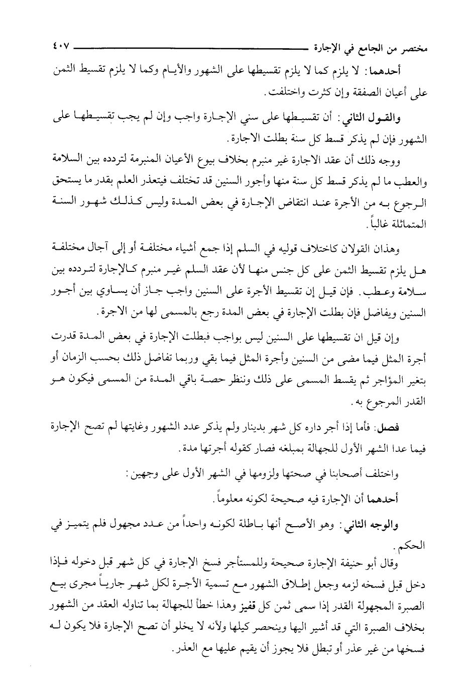 وَهَذَانِ الْقَوْلَانِ كَاخْتِلَافِ قَوْلَيْهِ فِي السَّلَمِ إِذَا جَمَعَ أَشْيَاءَ مُخْتَلِفَةً أَوْ إِلَى آجَالٍ مُخْتَلِفَةٍ هَلْ يَلْزَمُ تَقْسِيطُ الثَّمَنِ عَلَى كُلِّ جِنْسٍ مِنْهَا لِأَنَّ عَقْدَ السَّلَمِ غَيْرُ مُنْبَرِمٍ كَالْإِجَارَةِ لِتَرَدُّدِهِ بَيْنَ سَلَامَةٍ وَعَطَبٍ. فَإِنْ قِيلَ إِنْ تَقْسِيطَ الْأُجْرَةِ عَلَى السِّنِينَ وَاجِبٌ جَازَ أَنْ يُسَاوِيَ بَيْنَ أُجُورِ السِّنِينَ وَيُفَاضِلَ فَإِنْ بَطَلَتِ الْإِجَارَةُ فِي بَعْضِ الْمُدَّةِ رَجَعَ بِالْمُسَمَّى لَهَا مِنَ الْأُجْرَةِ.