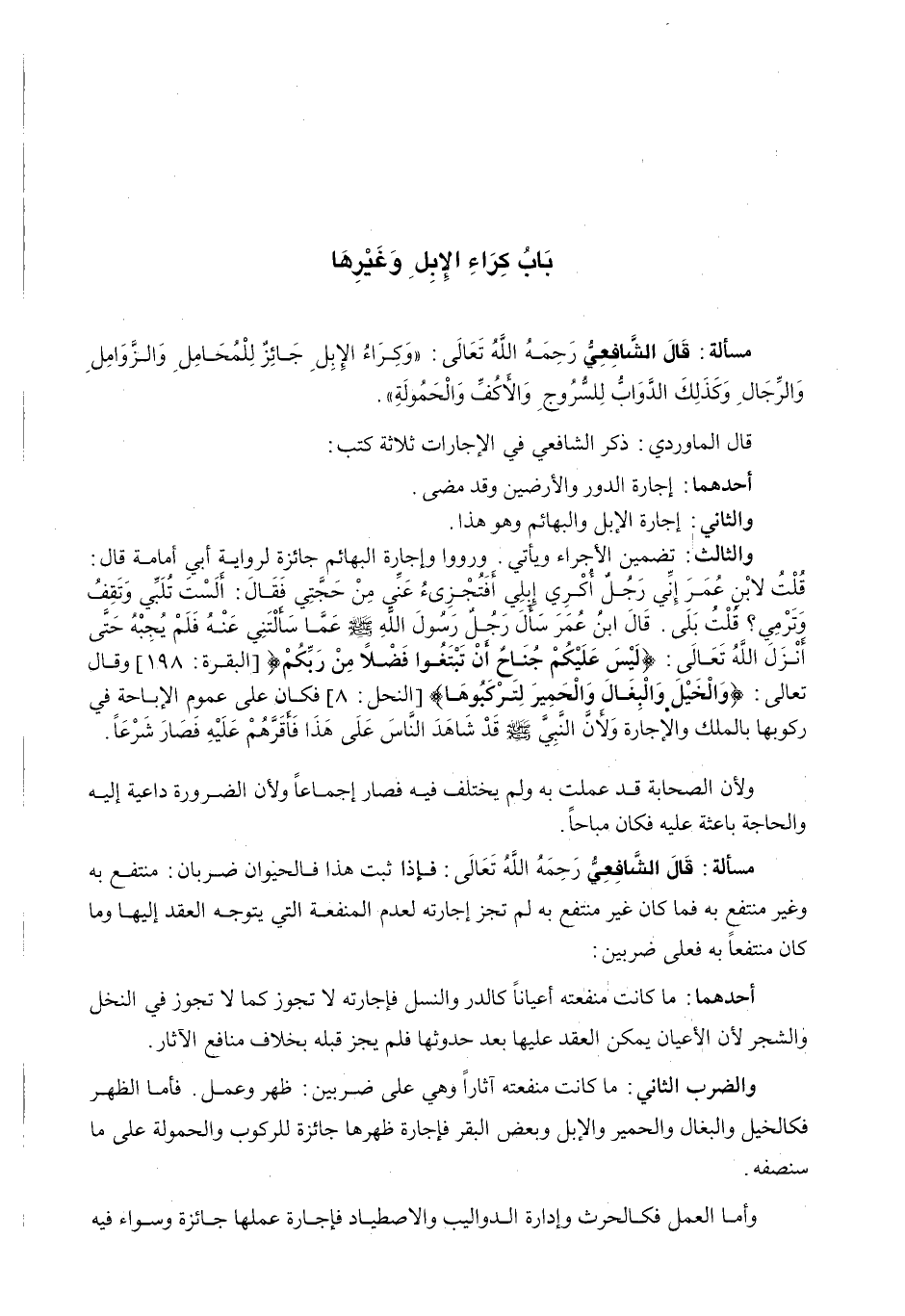 قال الشافعي رحمه الله تعالى: " وَكِرَاءُ الْإِبِلِ جائزٌ لِلْمَحَامِلِ وَالزَّوَامِلِ وَالرِّجَالِ وَكَذَلِكَ الدَّوَابُّ لِلسُّرُوجِ وَالْأَكُفِّ وَالْحَمُولَةِ ".