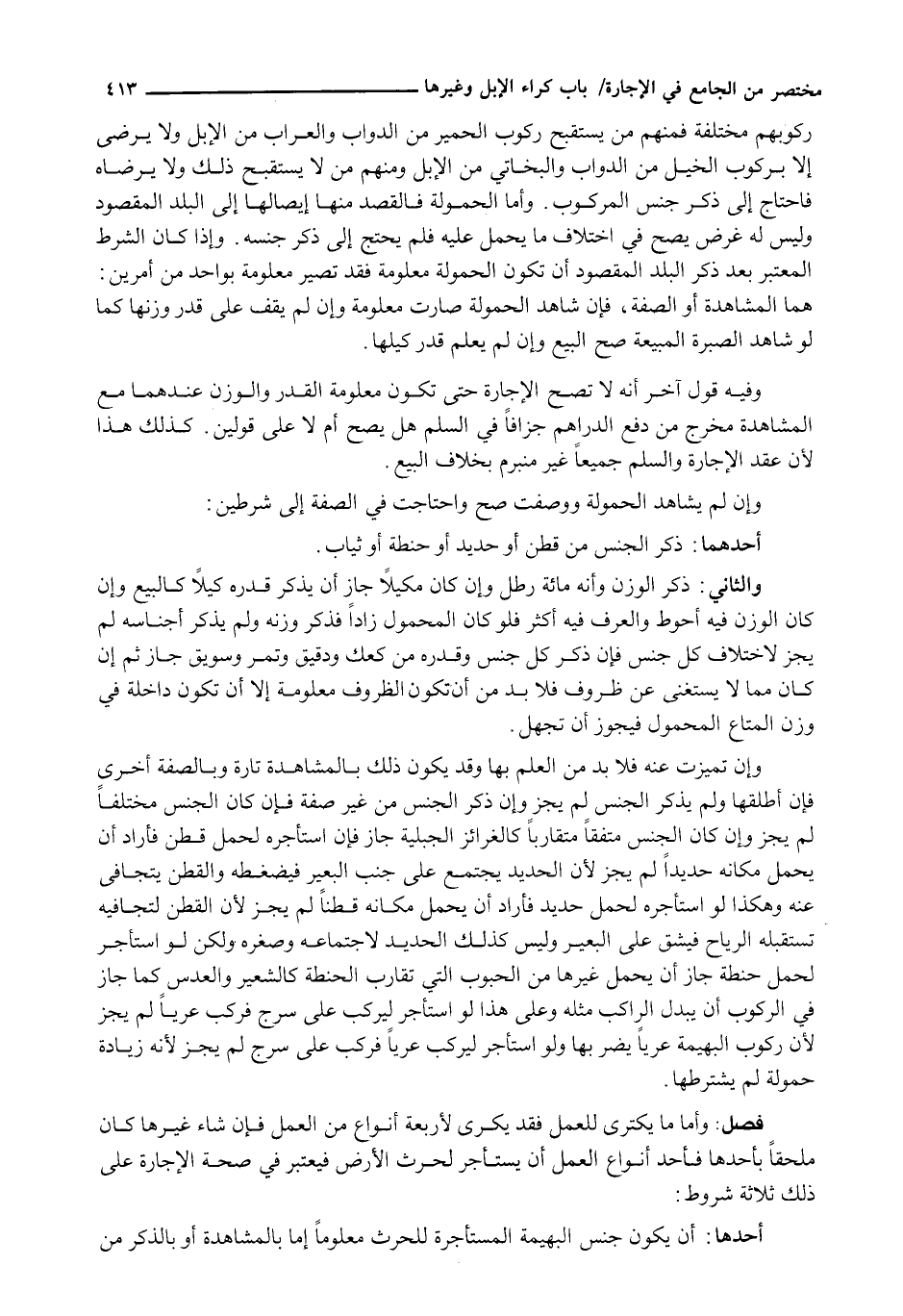 رُكُوبِهِمْ مُخْتَلِفَةٌ فَمِنْهُمْ مَنْ يَسْتَقْبِحُ رُكُوبَ الْحَمِيرِ مِنَ الدَّوَابِّ وَالْعِرَابِ مِنَ الْإِبِلِ وَلَا يَرْضَى إِلَّا بِرُكُوبِ الْخَيْلِ مِنَ الدَّوَابِّ وَالْبَخَاتِيِّ مِنَ الْإِبِلِ وَمِنْهُمْ مَنْ لَا يَسْتَقْبِحُ ذَلِكَ وَلَا يَرْضَاهُ فَاحْتَاجَ إِلَى ذِكْرِ جِنْسِ الْمَرْكُوبِ. وَأَمَّا الْحَمُولَةُ فَالْقَصْدُ مِنْهَا إِيصَالُهَا إِلَى الْبَلَدِ الْمَقْصُودِ وَلَيْسَ لَهُ غَرَضٌ يَصِحُّ فِي اخْتِلَافِ مَا يُحْمَلُ عَلَيْهِ فَلَمْ يَحْتَجْ إِلَى ذِكْرِ جِنْسِهِ. وَإِذَا كَانَ الشَّرْطُ الْمُعْتَبَرُ بَعْدَ ذِكْرِ الْبَلَدِ الْمَقْصُودِ أَنْ تَكُونَ الْحَمُولَةُ مَعْلُومَةً فَقَدْ تَصِيرُ مَعْلُومَةً بِوَاحِدٍ مِنْ أَمْرَيْنِ: هُمَا الْمُشَاهَدَةُ أَوِ الصِّفَةُ، فَإِنْ شَاهَدَ الْحَمُولَةَ صَارَتْ مَعْلُومَةً وَإِنْ لَمْ يَقِفْ عَلَى قَدْرِ وَزْنِهَا كَمَا لَوْ شَاهَدَ الصُّبْرَةَ الْمَبِيعَةَ صَحَّ الْبَيْعُ وَإِنْ لَمْ يَعْلَمْ قَدْرَ كَيْلِهَا.