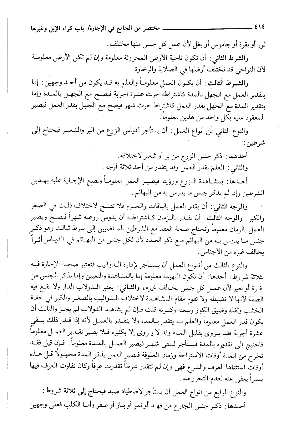 وَالنَّوْعُ الثَّالِثُ مِنْ أَنْوَاعِ الْعَمَلِ أَنْ يُسْتَأْجَرَ لِإِدَارَةِ الدَّوَالِيبِ فَتُعْتَبَرُ صِحَّةُ الْإِجَارَةِ فِيهِ بِثَلَاثَةِ شُرُوطٍ: أَحَدُهَا: أَنْ تَكُونَ الْبَهِيمَةُ مَعْلُومَةً إِمَّا بِالْمُشَاهَدَةِ وَالتَّعْيِينِ وَإِمَّا بِذِكْرِ الْجِنْسِ مِنْ بَقَرَةٍ أَوْ بَعِيرٍ لِأَنَّ عَمَلَ كُلِّ جِنْسٍ يُخَالِفُ غَيْرَهُ، وَالثَّانِي: يَعْتَبِرُ الدُّولَابَ الدَّارَ وَلَا تَقَعُ فِيهِ الصِّفَةُ لِأَنَّهَا لَا تَضْبُطُهُ وَلَا تَقُومُ مَقَامَ الْمُشَاهِدَةِ لِاخْتِلَافِ الدَّوَالِيبِ بِالصِّغَرِ وَالْكِبَرِ فِي خِفَّةِ الْخَشَبِ وَثِقَلِهِ وَضِيقِ الْكُوزِ وَسَعَتِهِ وَكَثْرَتِهِ قُلْتُ فَإِنْ لَمْ يُشَاهِدِ الدُّولَابَ لَمْ يَجُزْ وَالثَّالِثُ أَنْ يَكُونَ قَدْرُ الْعَمَلِ مَعْلُومًا وَالْعِلْمُ بِهِ يَتَقَدَّرُ بِالْمُدَّةِ وَلَا يَتَقَدَّرُ بِالْعَمَلِ لِأَنَّهُ إِذَا قُدِّرَ ذَلِكَ بِسَقْيِ عَشْرَةِ أَجْرِبَةٍ فَقَدْ يُرْوَى بِقَلِيلِ الْمَاءِ وَقَدْ لَا يُرْوَى إِلَّا بِكَثِيرِهِ فَلَا يَصِيرُ تَقْدِيرُ الْعَمَلِ مَعْلُومًا فَاحْتِيجَ إِلَى تَقْدِيرِهِ بِالْمُدَّةِ فَيُسْتَأْجَرُ لِسَقْيِ شَهْرٍ فَيَصِيرُ الْعَمَلُ بِالْمُدَّةِ مَعْلُومًا. فَإِنْ قِيلَ فَقَدْ تَخْرُجُ مِنَ الْمُدَّةِ أَوْقَاتُ الِاسْتِرَاحَةِ وَزَمَانُ الْعُلُوفَةِ فَيُصِيرُ الْعَمَلُ بِذِكْرِ الْمُدَّةِ مَجْهُولًا قِيلَ هَذِهِ أَوْقَاتٌ اسْتَثْنَاهَا الْعُرْفُ وَالشَّرْعُ فَهِيَ وَإِنْ لَمْ تَتَقَدَّرْ شَرْطًا تَقَدَّرَتْ عُرْفًا وَكَانَ تَفَاوُتُ الْعُرْفِ فِيهَا يَسِيرًا يُعْفَى عنه لعدم التحرر مِنْهُ.