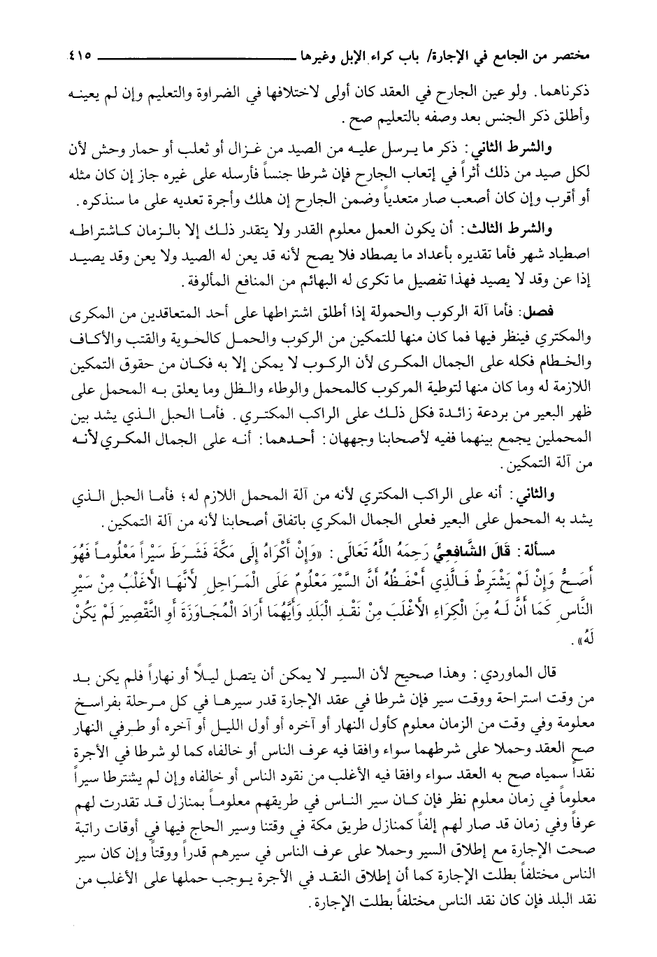 قَالَ الْمَاوَرْدِيُّ: وَهَذَا صَحِيحٌ لِأَنَّ السَّيْرَ لَا يُمْكِنُ أَنْ يَتَّصِلَ لَيْلًا أَوْ نَهَارًا فَلَمْ يَكُنْ بُدٌّ مِنْ وَقْتِ اسْتِرَاحَةِ وَوَقْتِ سَيْرٍ فَإِنْ شَرَطَا فِي عَقْدِ الْإِجَارَةِ قَدْرَ سَيْرِهَا فِي كُلِّ مَرْحَلَةٍ بِفَرَاسِخَ مَعْلُومَةٍ وَفِي وَقْتٍ مِنَ الزَّمَانِ مَعْلُومٍ كَأَوَّلِ النَّهَارِ أَوْ آخِرِهِ أَوْ أَوَّلِ اللَّيْلِ أَوْ آخِرِهِ أَوْ طَرَفَيِ النَّهَارِ صَحَّ الْعَقْدُ وَحُمِلَا عَلَى شَرْطِهِمَا سَوَاءٌ وَافَقَا فِيهِ عُرْفَ النَّاسِ أَوْ خَالَفَاهُ كَمَا لَوْ شَرَطَا فِي الْأُجْرَةِ نَقْدًا سَمَّيَاهُ صَحَّ بِهِ العقد سواء وافقا في الْأَغْلَبُ مِنْ نُقُودِ النَّاسِ أَوْ خَالَفَاهُ وَإِنْ لَمْ يَشْتَرِطَا سَيْرًا مَعْلُومًا فِي زَمَانٍ مَعْلُومٍ نُظِرَ فَإِنْ كَانَ سَيْرُ النَّاسِ فِي طَرِيقِهِمْ مَعْلُومًا بِمَنَازِلَ قَدْ تَقَدَّرَتْ لَهُمْ عُرْفًا وَفِي زَمَانٍ قَدْ صَارَ لَهُمْ إِلْفًا كَمَنَازِلِ طَرِيقِ مَكَّةَ فِي وَقْتِنَا وَسَيْرُ الْحَاجِّ فِيهَا فِي أَوْقَاتٍ رَاتِبَةٍ صَحَّتِ الْإِجَارَةُ مَعَ إِطْلَاقِ السَّيْرِ وَحُمِلَا عَلَى عُرْفِ النَّاسِ فِي سَيْرِهِمْ قَدْرًا وَوَقْتًا وَإِنْ كَانَ سَيْرُ النَّاسِ مُخْتَلِفًا بَطَلَتِ الْإِجَارَةُ كَمَا أَنَّ إِطْلَاقَ النَّقْدِ فِي الْأُجْرَةِ يُوجِبُ حَمْلَهَا عَلَى الْأَغْلَبِ مِنْ نَقْدِ الْبَلَدِ فَإِنْ كَانَ نَقْدُ النَّاسِ مُخْتَلِفًا بَطَلَتِ الْإِجَارَةُ.