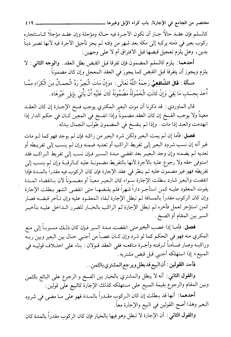 : فَأَمَّا إِنْ لَمْ يَمُتِ الْبَعِيرُ وَلَكِنْ شَرَدَ الْبَعِيرُ مِنْ رَاكِبِهِ فَإِنْ لَمْ يُوجَدْ فَهُوَ كَمَا لَوْ مَاتَ غَيْرَ أَنَّهُ إِنْ نُسِبَ شُرُودُ الْبَعِيرِ إِلَى تَفْرِيطِ الرَّاكِبِ أَوْ تَعَدِّيهِ ضَمِنَهُ وَإِنْ لَمْ يُنْسَبْ إِلَى تَفْرِيطِهِ أَوْ تَعَدِّيهِ لَمْ يَضْمَنْهُ وَإِنْ وُجِدَ الْبَعِيرُ بَعْدَ تَقَضِّي مُدَّةِ الْمَسِيرِ فَإِنْ نُسِبَ إِلَى تَفْرِيطِ الرَّاكِبِ فَقَدِ اسْتَوْفَى حَقَّهُ وَلَا رُجُوعَ عَلَيْهِ بِالْأُجْرَةِ لِأَنَّهَا بِالتَّفْرِيطِ مَضْمُونَةٌ عَلَيْهِ كَالرَّقَبَةِ وَإِنْ لَمْ يُنْسَبْ إِلَى تَفْرِيطِهِ فَهُوَ غَيْرُ مَضْمُونٍ عَلَيْهِ ثُمَّ يُنْظَرُ فِي عَقْدِ الْإِجَارَةِ فَإِنْ كَانَ الرُّكُوبُ فِيهِ مُقَدَّرًا بِالْمُدَّةِ فَإِذَا انْقَضَتْ وَالْبَعِيرُ شَارِدٌ بَطَلَتِ الْإِجَارَةُ سَوَاءٌ كَانَ الْبَعِيرُ مُعَيَّنًا أَوْ مَضْمُونًا لِأَنَّ بِانْقِضَاءِ الْمُدَّةِ يَفُوتُ الْمَعْقُودُ عَلَيْهِ كَمَنِ اسْتَأْجَرَ دَارًا شَهْرًا فَلَمْ يَقْبِضْهَا حَتَّى انْقَضَى الشَّهْرُ بَطَلَتِ الْإِجَارَةُ وَإِنْ كَانَ الرُّكُوبُ مُقَدَّرًا بِالْمَسَافَةِ لَمْ تَبْطُلِ الْإِجَارَةُ لِبَقَاءِ الْمَعْقُودِ عَلَيْهِ وَإِنْ تَأَخَّرَ قَبْضُهُ فَصَارَ كَمَنِ اسْتُؤْجِرَ لِعَمَلٍ فَأَخَّرَهُ لَمْ تَبْطُلِ الْإِجَارَةُ ثُمَّ الرَّاكِبُ بِالْخِيَارِ لِلضَّرَرِ الدَّاخِلِ عَلَيْهِ بِتَأْخِيرِ السَّيْرِ بَيْنَ الْمُقَامِ أَوِ الْفَسْخِ.