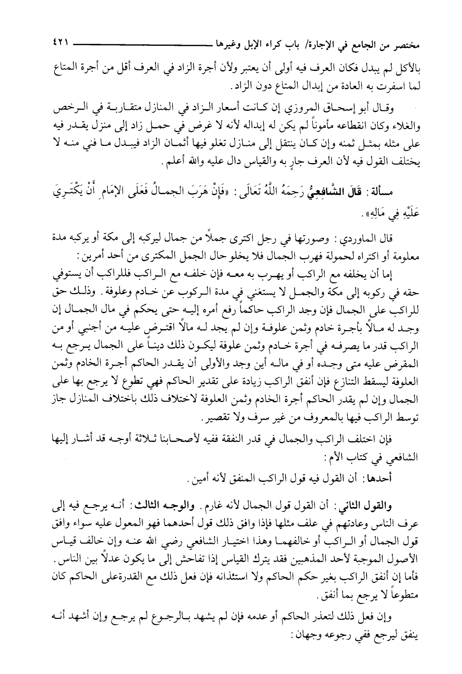 وَالْقَوْلُ الثَّانِي: أَنَّ الْقَوْلَ قَوْلُ الْجَمَّالِ لِأَنَّهُ غَارِمٌ. وَالْوَجْهُ الثَّالِثُ: أَنَّهُ يَرْجِعُ فِيهِ إِلَى عُرْفِ النَّاسِ وَعَادَتِهِمْ فِي عَلَفٍ مِثْلِهَا فَإِذَا وَافَقَ ذَلِكَ قَوْلَ أَحَدِهِمَا فَهُوَ الْمُعَوَّلُ عَلَيْهِ سَوَاءٌ وَافَقَ قَوْلَ الْجَمَّالِ أَوِ الرَّاكِبِ أَوْ خَالَفَهُمَا وَهَذَا اخْتِيَارُ الشَّافِعِيِّ رَضِيَ اللَّهُ عَنْهُ وَإِنْ خَالَفَ قِيَاسَ الْأُصُولِ الْمُوجِبَةِ لِأَحَدِ الْمَذْهَبَيْنِ فَقَدْ يُتْرَكُ الْقِيَاسُ إِذَا تَفَاحَشَ إِلَى مَا يَكُونُ عَدْلًا بَيْنَ النَّاسِ. فَأَمَّا إِنْ أَنْفَقَ الرَّاكِبُ بِغَيْرِ حُكْمِ الْحَاكِمِ وَلَا اسْتِئْذَانِهِ فَإِنْ فَعَلَ ذَلِكَ مَعَ الْقُدْرَةِ عَلَى الْحَاكِمِ كَانَ مُتَطَوِّعًا لَا يَرْجِعُ بِمَا أَنْفَقَ.