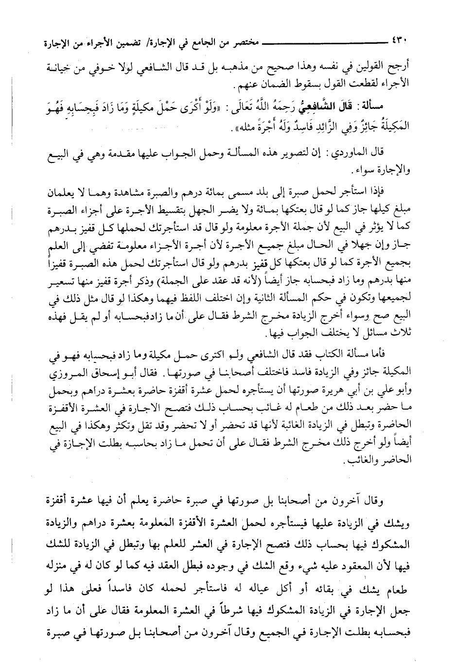 فَأَمَّا مَسْأَلَةُ الْكِتَابِ فَقَدْ قَالَ الشَّافِعِيُّ وَلَوِ اكْتَرَى حَمْلَ مَكِيلَةٍ وَمَا زَادَ فَبِحِسَابِهِ فَهُوَ فِي الْمَكِيلَةِ جَائِزٌ وَفِي الزِّيَادَةِ فَاسِدٌ فَاخْتَلَفَ أَصْحَابُنَا فِي صُورَتِهَا. فَقَالَ أَبُو إِسْحَاقَ الْمَرْوَزِيُّ وَأَبُو عَلِيِّ بْنُ أَبِي هُرَيْرَةَ صُورُتُهَا أَنْ يَسْتَأْجِرَهُ لِحَمْلِ عَشَرَةِ أَقْفِزَةٍ حَاضِرَةٍ بِعَشَرَةِ دَرَاهِمَ وَبِحَمْلِ مَا حَضَرَ بَعْدَ ذَلِكَ مِنْ طَعَامٍ لَهُ غَائِبٍ بِحِسَابِ ذَلِكَ فَتَصِحَّ الْإِجَارَةُ فِي الْعَشَرَةِ الْأَقْفِزَةِ الْحَاضِرَةِ وَتَبْطُلُ فِي الزِّيَادَةِ الْغَائِبَةِ لِأَنَّهَا قَدْ تَحْضُرُ أَوْ لَا تَحْضُرُ وَقَدْ تَقِلُّ وَتَكْثُرُ وَهَكَذَا فِي الْبَيْعِ أَيْضًا وَلَوْ أَخْرَجَ ذَلِكَ مَخْرَجَ الشَّرْطِ فَقَالَ عَلَى أَنْ تحمل ما زاد بحاسبه بطلت الإجارة في الحاضر والغائب.