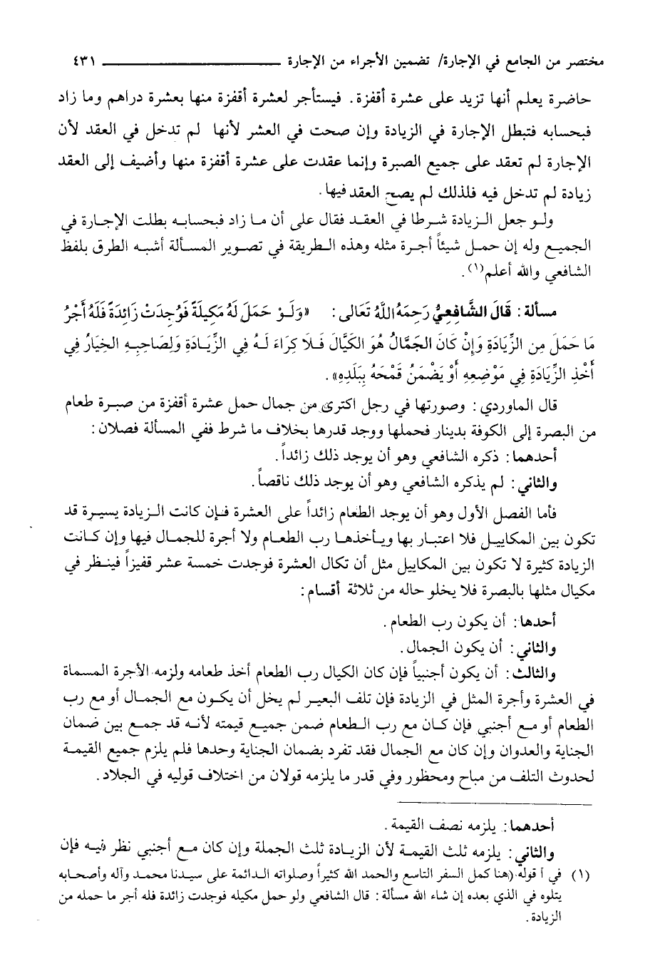 قَالَ الْمَاوَرْدِيُّ: وَصُورَتُهَا فِي رَجُلٍ اكْتَرَى مِنْ جَمَّالٍ حِمْلَ عَشَرَةِ أَقْفِزَةٍ مِنْ صُبْرَةِ طَعَامٍ مِنَ الْبَصْرَةِ إِلَى الْكُوفَةِ بِدِينَارٍ فَحَمَلَهَا وَوَجَدَ قَدْرَهَا بِخِلَافِ مَا شَرَطَ فَفِي الْمَسْأَلَةِ فَصْلَانِ: