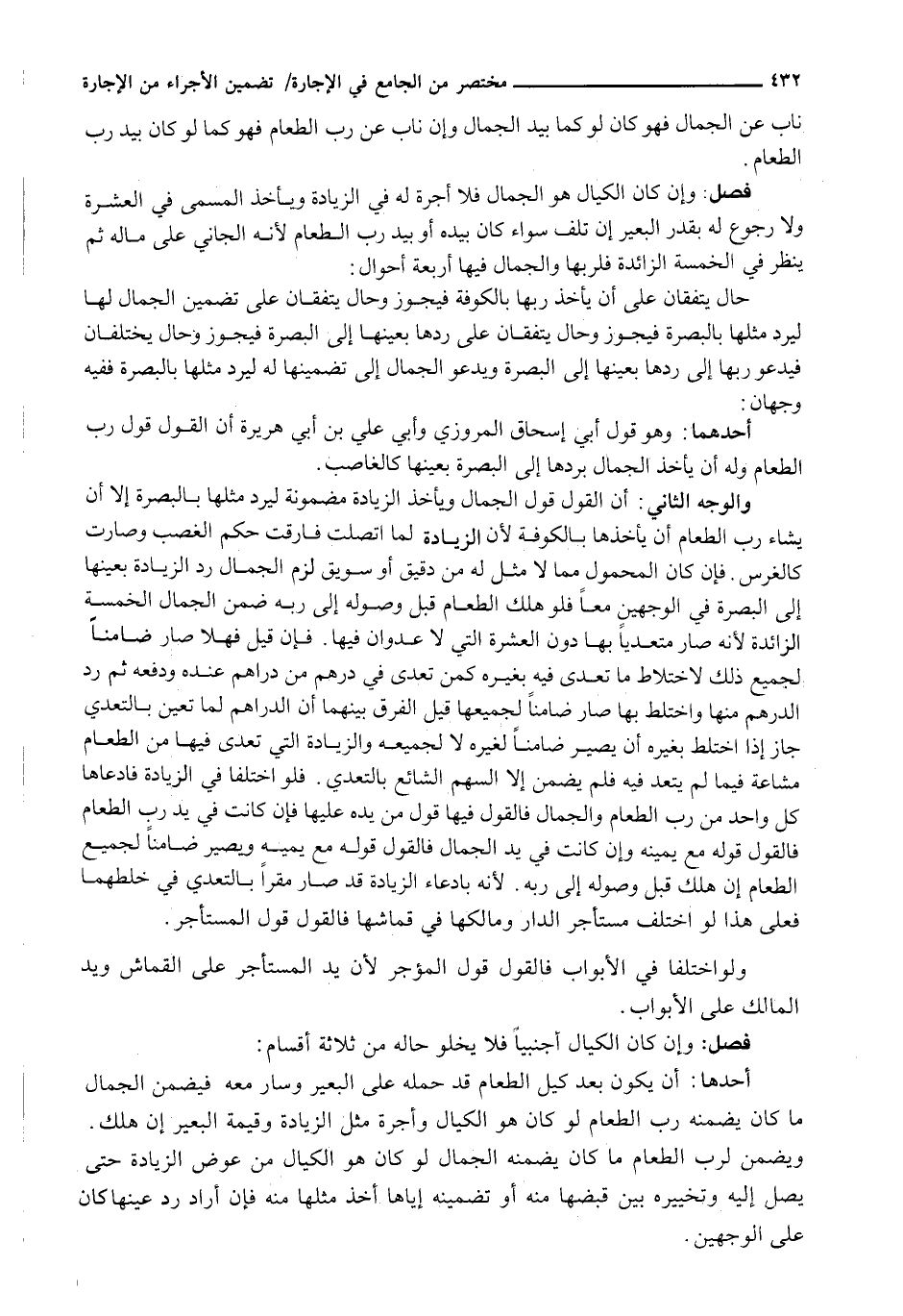 وَالْوَجْهُ الثَّانِي: أَنَّ الْقَوْلَ قَوْلُ الْجَمَّالِ وَيَأْخُذُ الزِّيَادَةَ مَضْمُونَةً لِيَرُدَّ مِثْلَهَا بِالْبَصْرَةِ إِلَّا أَنْ يَشَاءَ رَبُّ الطَّعَامِ أَنْ يَأْخُذَهَا بِالْكُوفَةِ لِأَنَّ الزِّيَادَةَ لَمَّا اتَّصَلَتْ فَارَقَتْ حُكْمَ الْغَصْبِ وَصَارَتْ كَالْغَرْسِ. فَإِنْ كَانَ الْمَحْمُولُ مِمَّا لَا مِثْلَ لَهُ مِنْ دَقِيقٍ أَوْ سَوِيقٍ لَزِمَ الْجَمَّالَ رَدُّ الزِّيَادَةِ بِعَيْنِهَا إِلَى الْبَصْرَةِ فِي الْوَجْهَيْنِ مَعًا فَلَوْ هَلَكَ الطَّعَامُ قَبْلَ وُصُولِهِ إِلَى رَبِّهِ ضَمِنَ الْجَمَّالُ الْخَمْسَةَ الزَّائِدَةَ لِأَنَّهُ صَارَ مُتَعَدِّيًا بِهَا دُونَ الْعَشَرَةِ الَّتِي لَا عُدْوَانَ فِيهَا. فَإِنْ قِيلَ فَهَلَّا صَارَ ضَامِنًا لِجَمِيعِ ذَلِكَ لِاخْتِلَاطِ مَا تَعَدَّى فِيهِ بِغَيْرِهِ كَمَنْ تَعَدَّى فِي دِرْهَمٍ مِنْ دَرَاهِمَ عِنْدَهُ وَدَفَعَهُ ثُمَّ رَدَّ الدِّرْهَمَ منها واختلط بها صار ضامناً لجميعها قبل الْفَرْقُ بَيْنَهُمَا أَنَّ الدَّرَاهِمَ لَمَّا تَعَيَّنَ بِالتَّعَدِّي جَازَ إِذَا اخْتَلَطَ بِغَيْرِهِ أَنْ يَصِيرَ ضَامِنًا لِغَيْرِهِ لَا لِجَمِيعِهِ وَالزِّيَادَةُ الَّتِي تَعَدَّى فِيهَا مِنَ الطَّعَامِ مُشَاعَةٌ فِيمَا لَمْ يَتَعَدَّ فِيهِ فَلَمْ يَضْمَنْ إِلَّا السَّهْمَ الشَّائِعَ بِالتَّعَدِّي. فَلَوِ اخْتَلَفَا فِي الزِّيَادَةِ فَادَّعَاهَا كُلُّ وَاحِدٍ مِنْ رَبِّ الطَّعَامِ وَالْجَمَّالِ فَالْقَوْلُ فِيهَا قَوْلُ مَنْ يَدُهُ عَلَيْهَا فَإِنْ كَانَتْ فِي يَدِ رَبِّ الطَّعَامِ فَالْقَوْلُ قَوْلُهُ مَعَ يَمِينِهِ وَإِنْ كَانَتْ فِي يَدِ الْجَمَّالِ فَالْقَوْلُ قَوْلُهُ مَعَ يَمِينِهِ وَيَصِيرُ ضَامِنًا لِجَمِيعِ الطَّعَامِ إِنْ هَلَكَ قَبْلَ وُصُولِهِ إِلَى رَبِّهِ. لِأَنَّهُ بِادِّعَاءِ الزِّيَادَةِ قَدْ صَارَ مُقِرًّا بِالتَّعَدِّي فِي خَلْطِهِمَا فَعَلَى هَذَا لَوِ اخْتَلَفَ مُسْتَأْجِرُ الدَّارِ وَمَالِكُهَا فِي قُمَاشِهَا فَالْقَوْلُ قَوْلُ الْمُسْتَأْجِرِ.