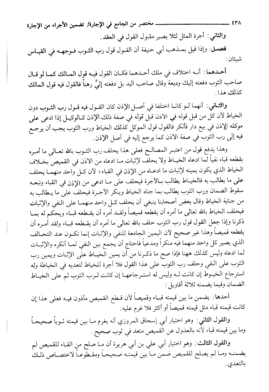 وَهَذَا يَدْفَعُ قَوْلَ مَنِ اعْتَبَرَ الْمَصَالِحَ فَعَلَى هَذَا يَحْلِفُ رَبُّ الثَّوْبِ بِاللَّهِ تَعَالَى مَا أَمَرَهُ بِقَطْعِهِ قَبَاءً نَفْيًا لِمَا ادَّعَاهُ الْخَيَّاطُ وَلَا يَحْلِفُ لِإِثْبَاتِ مَا ادَّعَاهُ مِنَ الْإِذْنِ فِي الْقَمِيصِ بِخِلَافِ الْخَيَّاطِ الَّذِي يَكُونُ يَمِينُهُ لِإِثْبَاتِ مَا ادَّعَاهُ مِنَ الْإِذْنِ فِي الْقَبَاءِ؛ لِأَنَّ كُلَّ وَاحِدٍ مِنْهُمَا يَحْلِفُ عَلَى مَا يُطَالِبُ بِهِ فَالْخَيَّاطُ يُطَالِبُ بِالْأُجْرَةِ فَيَحْلِفُ عَلَى مَا ادَّعَى مِنَ الْإِذْنِ فِي الْقَبَاءِ وَتَبِعَهُ سُقُوطُ الضَّمَانِ وَرَبُّ الثَّوْبِ يُطَالِبُ بِمَا جَنَاهُ الْخَيَّاطُ وَيُنْكِرُ الْأُجْرَةَ فَيَحْلِفُ عَلَى مَا يُطَالِبُ بِهِ مِنْ جِنَايَةِ الْخَيَّاطِ وَقَالَ بَعْضُ أَصْحَابِنَا يَنْبَغِي أَنْ يَحْلِفَ كُلُّ وَاحِدٍ مِنْهُمَا عَلَى النَّفْيِ وَالْإِثْبَاتِ فَيَحْلِفُ الْخَيَّاطُ بِاللَّهِ تَعَالَى مَا أَمَرَهُ أَنْ يَقْطَعَهُ قَمِيصًا وَلَقَدْ أَمَرَهُ أَنْ يَقْطَعَهُ قَبَاءً وَيُحْكَمُ لَهُ بِمَا ذَكَرْنَا وَإِذَا جُعِلَ الْقَوْلُ قَوْلَ رَبِّ الثَّوْبِ حَلَفَ بِاللَّهِ تَعَالَى مَا أَمَرَهُ أَنْ يَقْطَعَهُ قَبَاءً وَلَقَدْ أَمَرَهُ أَنْ يَقْطَعَهُ قَمِيصًا وَهَذَا غَيْرُ صَحِيحٍ لِأَنَّ الْيَمِينَ الْجَامِعَةَ لِلنَّفْيِ وَالْإِثْبَاتِ إِنَّمَا تَكُونُ عِنْدَ التَّحَالُفِ الَّذِي يَصِيرُ كُلُّ وَاحِدٍ مِنْهُمَا فِيهِ مُنْكِرًا وَمُدَّعِيًا فَاحْتَاجَ أَنْ يَجْمَعَ بَيْنَ النَّفْيِ لِمَا أَنْكَرَهُ وَالْإِثْبَاتِ لِمَا ادَّعَاهُ وَلَيْسَ كَذَلِكَ ههنا فَإِذَا صَحَّ مَا ذَكَرْنَا مِنْ أَنَّ يَمِينَ الْخَيَّاطِ عَلَى الْإِثْبَاتِ وَيَمِينَ رَبِّ الثَّوْبِ عَلَى النَّفْيِ وَحَلَفَ رَبُّ الثَّوْبِ عَلَى هَذَا الْقَوْلِ فَلَا أُجْرَةَ لِلْخَيَّاطِ لِتَعَدِّيهِ فِي الْخِيَاطَةِ وَلَهُ اسْتِرْجَاعُ الْخُيُوطِ إِنْ كَانَتْ لَهُ وَلَيْسَ لَهُ اسْتِرْجَاعُهَا إِنْ كَانَتْ لِرَبِّ الثَّوْبِ ثُمَّ عَلَى الْخَيَّاطِ الضَّمَانُ وَفِيمَا يَضْمَنُهُ ثَلَاثَةُ أَقَاوِيلَ: