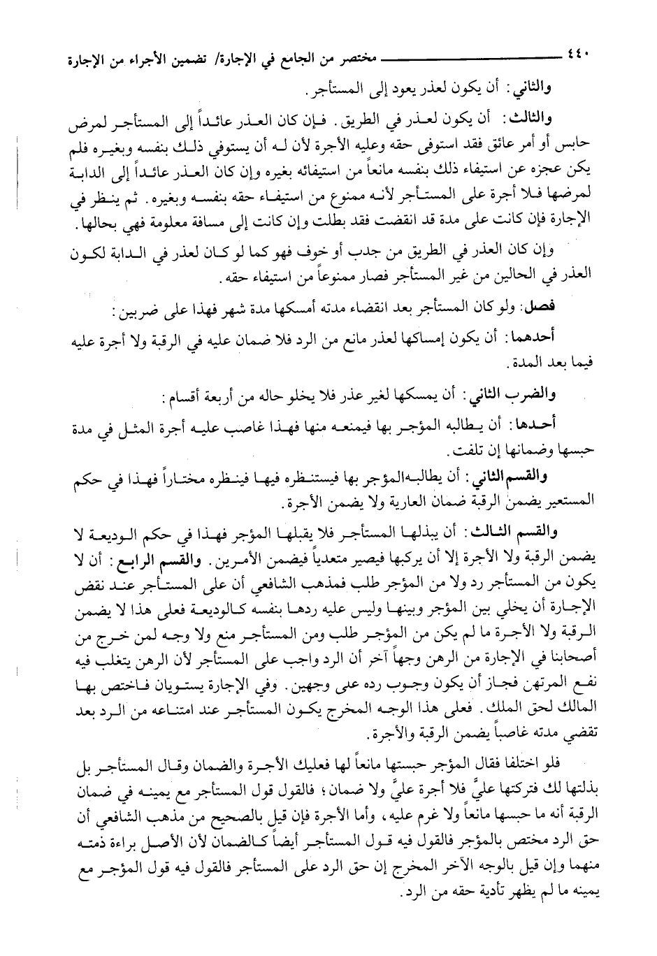 وَالْقِسْمُ الثَّالِثُ: أَنْ يَبْذُلَهَا الْمُسْتَأْجِرُ فَلَا يَقْبَلَهَا الْمُؤَجِّرُ فَهَذَا فِي حُكْمِ الْوَدِيعَةِ لَا يَضْمَنُ الرَّقَبَةَ وَلَا الْأُجْرَةَ إِلَّا أَنْ يَرْكَبَهَا فَيَصِيرَ مُتَعَدِّيًا فَيَضْمَنَ الْأَمْرَيْنِ. وَالْقِسْمُ الرَّابِعُ: أَنْ لَا يَكُونَ مِنَ الْمُسْتَأْجِرِ رَدٌّ وَلَا مِنَ الْمُؤَجِّرِ طَلَبٌ فَمَذْهَبُ الشَّافِعِيِّ أَنَّ عَلَى الْمُسْتَأْجِرِ عِنْدَ نَقْضِ الْإِجَارَةِ أَنْ يُخَلِّيَ بَيْنَ الْمُؤَجِّرِ وَبَيْنَهَا وَلَيْسَ عَلَيْهِ رَدُّهَا بِنَفْسِهِ كَالْوَدِيعَةِ فَعَلَى هَذَا لَا يَضْمَنُ الرَّقَبَةَ وَلَا الْأُجْرَةَ مَا لَمْ يَكُنْ مِنَ الْمُؤَجِّرِ طَلَبٌ وَمِنَ الْمُسْتَأْجِرِ مَنْعٌ وَلَا وَجْهَ لِمَنْ خَرَّجَ مِنْ أَصْحَابِنَا فِي الْإِجَارَةِ مِنَ الرَّهْنِ وَجْهًا آخَرَ أَنَّ الرَّدَّ وَاجِبٌ عَلَى الْمُسْتَأْجِرِ لِأَنَّ الرَّهْنَ يَتَغَلَّبُ فِيهِ نَفْعُ الْمُرْتَهِنِ فَجَازَ أَنْ يَكُونَ وُجُوبُ رَدِّهِ عَلَى وَجْهَيْنِ. وَفِي الْإِجَارَةِ يَسْتَوِيَانِ فَاخْتَصَّ بِهَا الْمَالِكُ لِحَقِّ الْمِلْكِ. فَعَلَى هَذَا الْوَجْهِ الْمُخَرَّجِ يَكُونُ الْمُسْتَأْجِرُ عِنْدَ امْتِنَاعِهِ مِنَ الرَّدِّ بَعْدَ تَقَضِّي مُدَّتِهِ غَاصِبًا يَضْمَنُ الرَّقَبَةَ وَالْأُجْرَةَ.