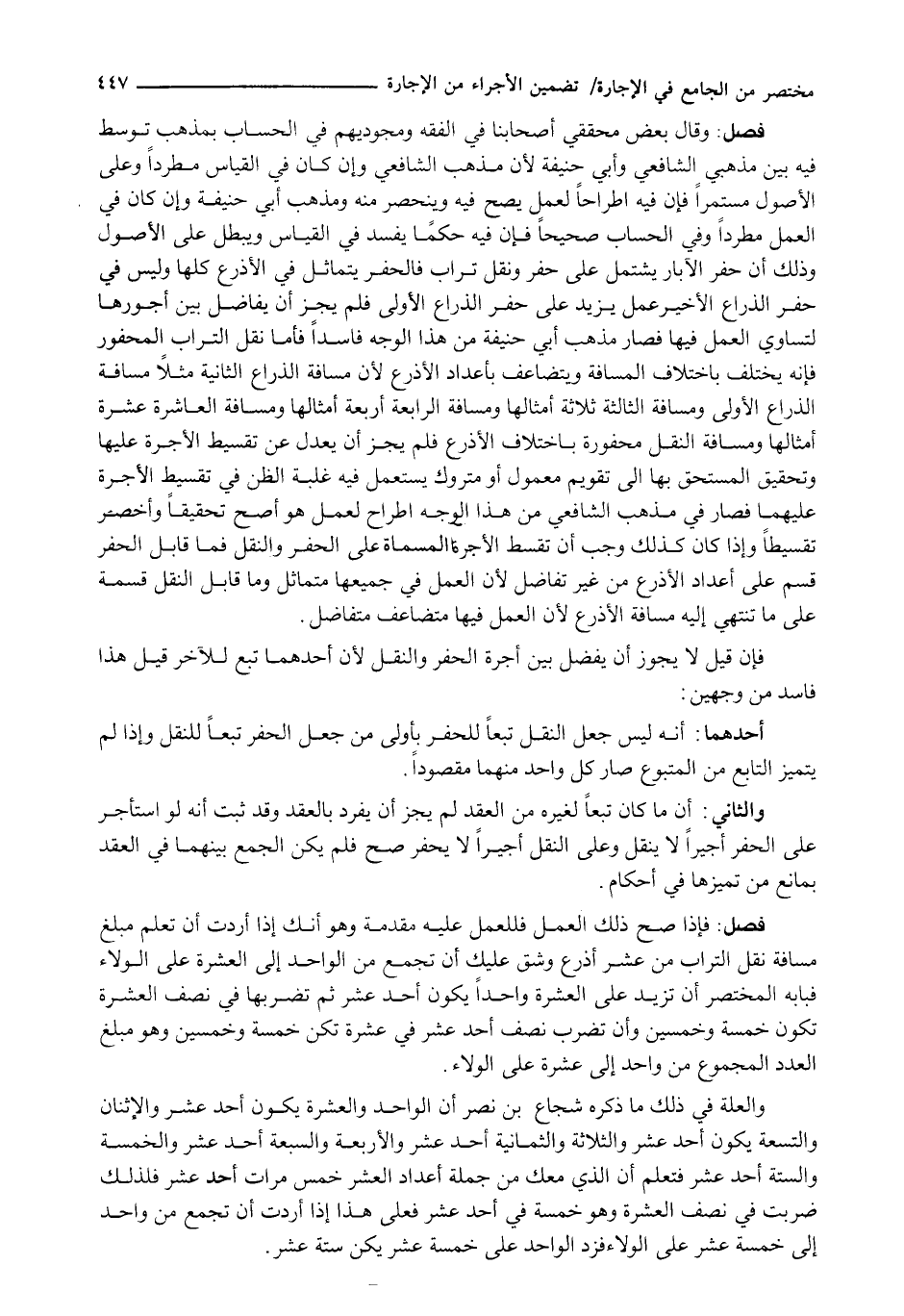 : وَقَالَ بَعْضُ مُحَقِّقِي أَصْحَابِنَا فِي الْفِقْهِ وَمُجَوِّدِيهِمْ فِي الْحِسَابِ بِمَذْهَبٍ تَوَسَّطَ فِيهِ بَيْنَ مَذْهَبِي الشَّافِعِيِّ وأبي حنيفة لِأَنَّ مَذْهَبَ الشَّافِعِيِّ وَإِنْ كَانَ فِي الْقِيَاسِ مُطَّرِدًا وَعَلَى الْأُصُولِ مُسْتَمِرًّا فَإِنَّ فِيهِ اطِّرَاحًا لِعَمَلٍ يَصِحُّ فِيهِ وَيَنْحَصِرُ مِنْهُ وَمَذْهَبَ أبي حنيفة وَإِنْ كَانَ فِي الْعَمَلِ مُطَّرِدًا وَفِي الْحِسَابِ صَحِيحًا فَإِنَّ فِيهِ حُكْمًا يَفْسُدُ فِي الْقِيَاسِ وَيَبْطُلُ عَلَى الْأُصُولِ وَذَلِكَ أَنَّ حَفْرَ الْآبَارِ يَشْتَمِلُ عَلَى حَفْرٍ وَنَقْلِ تُرَابٍ فَالْحَفْرُ يَتَمَاثَلُ فِي الْأَذْرُعِ كُلِّهَا وَلَيْسَ فِي حَفْرِ الذِّرَاعِ الْأَخِيرِ عَمَلٌ يَزِيدُ عَلَى حَفْرِ الذِّرَاعِ الْأُولَى فَلَمْ يَجُزْ أَنْ يُفَاضِلَ بَيْنَ أُجُورِهَا لِتَسَاوِي الْعَمَلِ فِيهَا فَصَارَ مَذْهَبُ أبي حنيفة مِنْ هَذَا الْوَجْهِ فَاسِدًا فَأَمَّا نَقْلُ التُّرَابِ الْمَحْفُورِ فَإِنَّهُ يَخْتَلِفُ بِاخْتِلَافِ الْمَسَافَةِ وَيَتَضَاعَفُ بِأَعْدَادِ الْأَذْرُعِ لِأَنَّ مَسَافَةَ الذِّرَاعِ الثَّانِيَةِ مِثْلَا مَسَافَةِ الذِّرَاعِ الْأُولَى وَمَسَافَةَ الثَّالِثَةِ ثَلَاثَةُ أَمْثَالِهَا وَمَسَافَةَ الرَّابِعَةِ أَرْبَعَةُ أَمْثَالِهَا وَمَسَافَةَ الْعَاشِرَةِ عَشَرَةُ أَمْثَالِهَا وَمَسَافَةَ النَّقْلِ مَحْفُورَةٌ بِاخْتِلَافِ الْأَذْرُعِ فَلَمْ يَجُزْ أَنْ يَعْدِلَ عَنْ تَقْسِيطِ الْأُجْرَةِ عَلَيْهَا وَتَحْقِيقِ الْمُسْتَحَقِّ بِهَا إِلَى تَقْوِيمٍ مَعْمُولٍ أَوْ مَتْرُوكٍ يُسْتَعْمَلُ فِيهِ غَلَبَةُ الظَّنِّ فِي تَقْسِيطِ الْأُجْرَةِ عَلَيْهِمَا فَصَارَ فِي مَذْهَبِ الشَّافِعِيِّ مِنْ هَذَا الْوَجْهِ اطِّرَاحٌ لِعَمَلٍ هُوَ أَصَحُّ تَحْقِيقًا وَأَخْصَرُ تَقْسِيطًا وَإِذَا كَانَ كَذَلِكَ وَجَبَ أَنْ تُقَسَّطَ الْأُجْرَةُ الْمُسَمَّاةُ عَلَى الْحَفْرِ وَالنَّقْلِ فَمَا قَابَلَ الْحَفْرَ قُسِّمَ عَلَى أَعْدَادِ الْأَذْرُعِ مِنْ غَيْرِ تَفَاضُلٍ لِأَنَّ الْعَمَلَ فِي جَمِيعِهَا مُتَمَاثِلٌ وَمَا قَابَلَ النَّقْلَ قِسْمَةٌ عَلَى مَا تَنْتَهِي إِلَيْهِ مَسَافَةُ الْأَذْرُعِ لِأَنَّ الْعَمَلَ فِيهَا مُتَضَاعِفٌ مُتَفَاضِلٌ.
