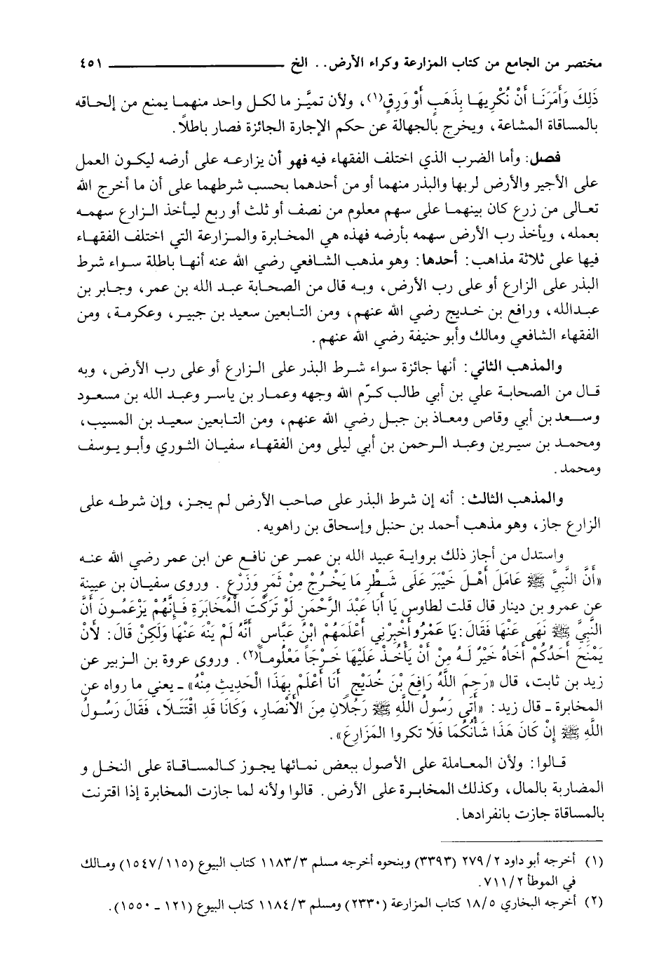 : وأما الضرب الذي اختلف الْفُقَهَاءُ فِيهِ فَهُوَ أَنْ يُزَارِعَهُ عَلَى أَرْضِهِ لِيَكُونَ الْعَمَلُ عَلَى الْأَجِيرِ وَالْأَرْضُ لِرَبِّهَا وَالْبَذْرُ مِنْهُمَا أَوْ مِنْ أَحَدِهِمَا بِحَسَبِ شَرْطِهِمَا عَلَى أَنَّ مَا أَخْرَجَ اللَّهُ تَعَالَى مِنْ زَرْعٍ كَانَ بَيْنَهُمَا عَلَى سَهْمٍ مَعْلُومٍ مِنْ نِصْفٍ أَوْ ثُلُثٍ أَوْ رُبُعٍ لِيَأْخُذَ الزَّارِعُ سَهْمَهُ بِعَمَلِهِ، وَيَأْخُذَ رَبُّ الْأَرْضِ سَهْمَهُ بِأَرْضِهِ فَهَذِهِ هِيَ الْمُخَابَرَةُ وَالْمُزَارِعَةُ الَّتِي اخْتَلَفَ الْفُقَهَاءُ فِيهَا عَلَى ثَلَاثَةِ مَذَاهِبَ: أَحَدُهَا: وَهُوَ مَذْهَبُ الشَّافِعِيِّ رَضِيَ اللَّهُ عَنْهُ أَنَّهَا بَاطِلَةٌ سَوَاءٌ شَرَطَ الْبَذْرَ عَلَى الزَّارِعِ أَوْ عَلَى رَبِّ الْأَرْضِ، وَبِهِ قَالَ مِنَ الصَّحَابَةِ عَبْدُ اللَّهِ بْنُ عُمَرَ، وَجَابِرُ بْنُ عَبْدِ اللَّهِ، وَرَافِعُ بْنُ خَدِيجٍ رَضِيَ اللَّهُ عَنْهُمْ، وَمِنَ التَّابِعِينَ سَعِيدُ بْنُ جُبَيْرٍ، وَعِكْرِمَةُ، وَمِنَ الْفُقَهَاءِ الشَّافِعِيُّ وَمَالِكٌ وأبو حنيفة رَضِيَ اللَّهُ عَنْهُمْ.