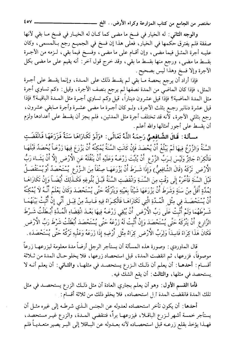 قال الشافعي رحمه الله تعالى: " وَلَوْ تَكَارَاهَا سَنَةً فَزَرَعَهَا فَانْقَضَتِ السَّنَةُ وَالزَّرْعُ فِيهَا لَمْ يَبْلُغْ أَنْ يُحْصَدَ فَإِنْ كَانَتِ السَّنَةُ يُمْكِنُهُ أَنْ يَزْرَعَ فِيهَا زَرْعَا يُحْصَدُ قَبْلَهَا فَالْكِرَاءُ جائزٌ وَلَيْسَ لِرَبِّ الزَّرْعِ أَنْ يُثَبِّتَ زَرْعَهُ وَعَلَيْهِ أَنْ يَنْقُلَهُ عَنِ الْأَرْضِ إلا أن يشاء رب الأرض تركه (قال الشافعي) وإذا شرط أن يزرعها صنفاً من الزرع يستحصد أو يستقصل قبل السنة فأخره إلى وقتٍ من السنة وانقضت السنة قبل بلوغه فكذلك أيضاً وإن تكاراها لمدةٍ أقل من سنةٍ وشرط أن يزرعها شيئاً بعينه ويتركه حتى يستحصد وكان يعلم أنه لا يمكنه أن يستحصد في مثل المدة التي تكاراها فالكراء فيه فاسدٌ من قبل أني إن أثبت بينهما شرطهما ولم أثبت على رب الأرض أن يبقي زرعه فيها بعد انقضاء المدة أبطلت شرط الزارع أن يتركه حتى يستحصد وإن أثبت له زرعه حتى يستحصد أبطلت شرط رب الأرض فكان هذا كراء فاسداً ولرب الأرض كراء مثل أرضه إذا زرعه وعليه تركه حتى يستحصد ".