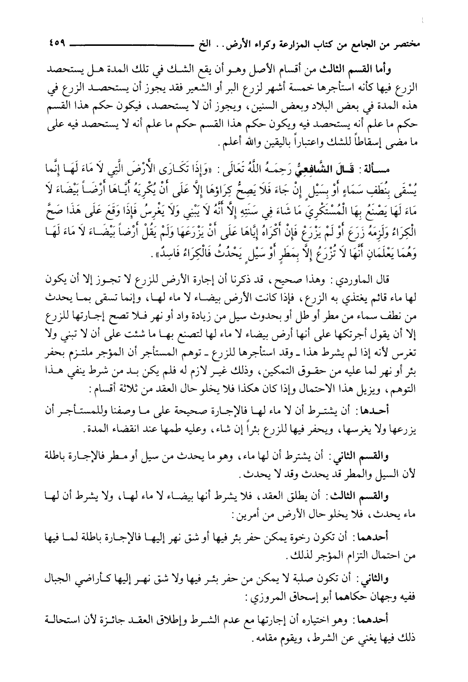 وَأَمَّا الْقِسْمُ الثَّالِثُ مِنْ أَقْسَامِ الْأَصْلِ وَهُوَ أَنْ يَقَعَ الشَّكُّ فِي تِلْكَ الْمُدَّةِ هَلْ يُسْتَحْصَدُ الزَّرْعُ فِيهَا كَأَنَّهُ اسْتَأْجَرَهَا خَمْسَةَ أَشْهُرٍ لِزَرْعِ الْبُرِّ أَوِ الشَّعِيرِ فَقَدْ يَجُوزُ أَنْ يُسْتَحْصَدَ الزَّرْعُ فِي هَذِهِ الْمُدَّةِ فِي بَعْضِ الْبِلَادِ وَبَعْضِ السِّنِينَ، وَيَجُوزُ أَنْ لَا يُسْتَحْصَدَ، فَيَكُونُ حُكْمُ هَذَا الْقِسْمِ حُكْمَ مَا عُلِمَ أَنَّهُ يُسْتَحْصَدُ فِيهِ وَيَكُونُ حُكْمُ هَذَا الْقِسْمِ حُكْمَ مَا عُلِمَ أَنَّهُ لَا يُسْتَحْصَدُ فِيهِ عَلَى مَا مَضَى إِسْقَاطًا لِلشَّكِّ وَاعْتِبَارًا بِالْيَقِينِ والله أعلم.