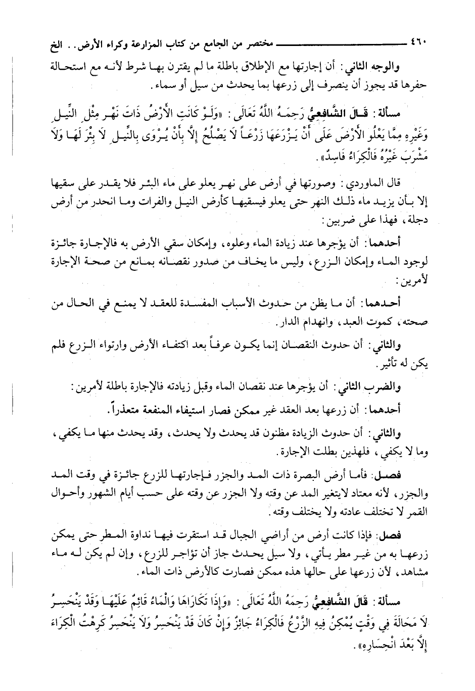 قال الشافعي رحمه الله تعالى: " وَلَوْ كَانَتِ الْأَرْضُ ذَاتَ نَهْرٍ مِثْلِ النِّيلِ وَغَيْرِهِ مِمَّا يَعْلُو الْأَرْضَ عَلَى أَنْ يَزْرَعَهَا زَرْعًا لَا يَصْلُحُ إِلَّا بِأَنْ يُرْوَى بِالنِّيلِ لَا بِئْرَ لَهَا وَلَا مَشْرَبَ غَيْرُهُ فَالْكِرَاءُ فاسدٌ ".