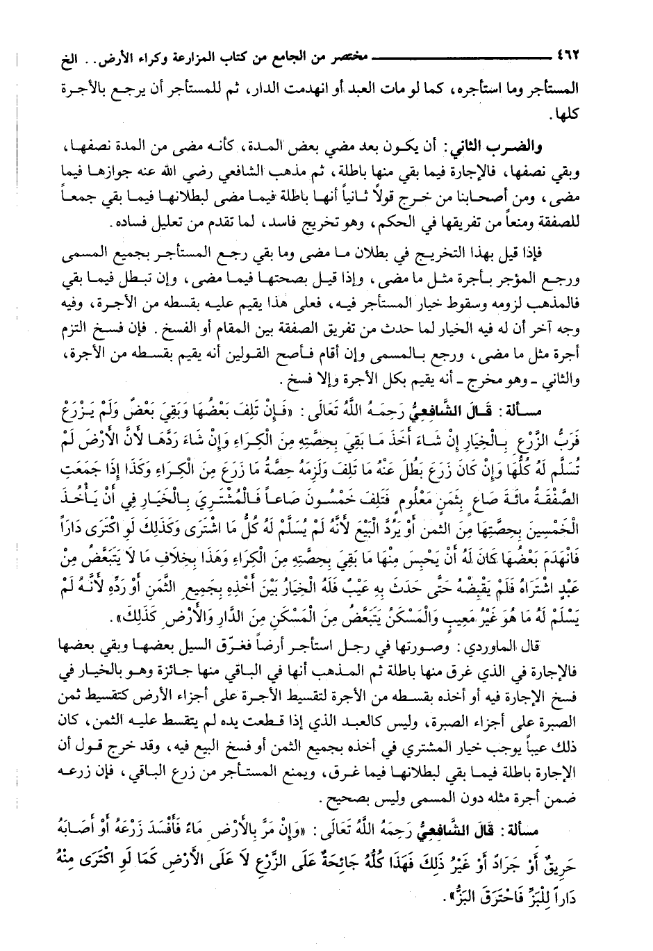 قَالَ الشافعي رحمه الله تعالى: " فَإِنْ تَلِفَ بَعْضُهَا وَبَقِيَ بَعْضٌ وَلَمْ يَزْرَعْ فَرَبُّ الزِّرْعِ بِالْخِيَارِ إِنْ شَاءَ أَخَذَ مَا بَقِيَ بِحِصَّتِهِ مِنَ الْكِرَاءِ وَإِنْ شَاءَ رَدَّهَا لِأَنَّ الْأَرْضَ لَمْ تُسَلَّمْ لَهُ كُلُّهَا وَإِنْ كَانَ زَرَعَ بَطَلَ عَنْهُ مَا تَلِفَ وَلَزِمَهُ حِصَّةُ مَا زَرَعَ مِنَ الْكِرَاءِ وَكَذَا إِذَا جَمَعَتِ الصَّفْقَةُ مِائَةَ صاعٍ بثمنٍ معلومٍ فَتَلِفَ خَمْسُونَ صَاعًا فَالْمُشْتَرِي بِالْخِيَارِ فِي أَنْ يَأْخُذَ الْخَمْسِينَ بِحِصَّتِهَا مِنَ الثَّمَنِ أَوْ يَرُدَّ الْبَيْعَ لِأَنَّهُ لَمْ يُسَلِّمْ لَهُ كُلَّ مَا اشْتَرَى وَكَذَلِكَ لَوِ اكْتَرَى دَارًا فَانْهَدَمَ بَعْضُهَا كَانَ لَهُ أَنْ يَحْبِسَ مِنْهَا مَا بَقِيَ بِحِصَّتِهِ مِنَ الْكِرَاءِ وَهَذَا بِخِلَافِ مَا لَا يَتَبَعَّضُ مِنْ عبدٍ اشْتَرَاهُ فَلَمْ يَقْبِضْهُ حَتَّى حَدَثَ بِهِ عيبُ فَلَهُ الْخِيَارُ بَيْنَ أَخْذِهِ بِجَمِيعِ الثَّمَنِ أَوْ رَدِّهِ لِأَنَّهُ لَمْ يَسْلَمْ لَهُ مَا هُوَ غَيْرُ معيبٍ وَالْمَسْكَنُ يَتَبَعَّضُ مِنَ الْمَسْكَنِ مِنَ الدَّارِ وَالْأَرْض كَذَلِكَ ".