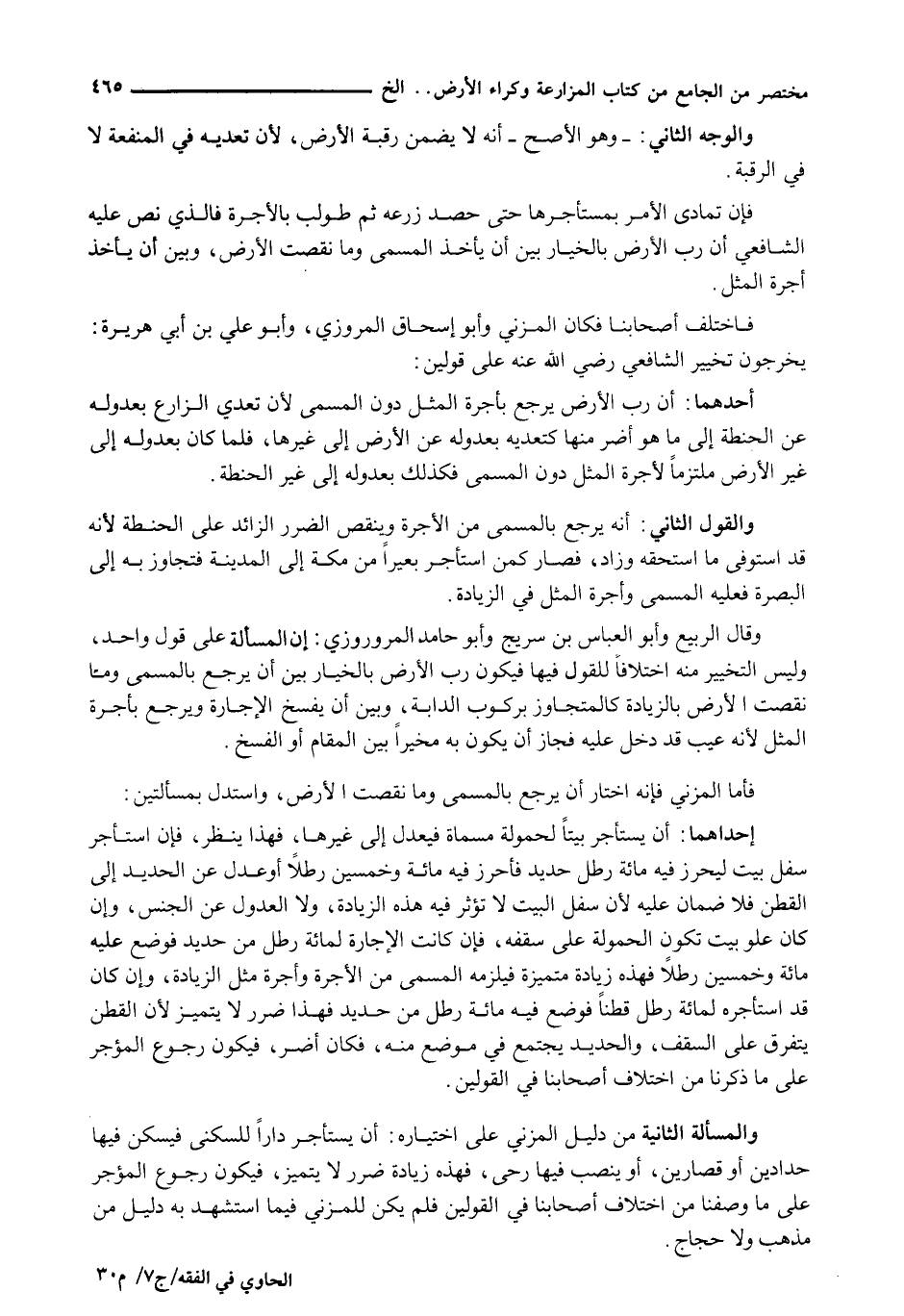 وَقَالَ الرَّبِيعُ وَأَبُو العباس بن سريج وأبو حامد المروروزي: إِنَّ الْمَسْأَلَةَ عَلَى قَوْلٍ وَاحِدٍ، وَلَيْسَ التَّخْيِيرُ مِنْهُ اخْتِلَافًا لِلْقَوْلِ فِيهَا فَيَكُونُ رَبُّ الْأَرْضِ بِالْخِيَارِ بَيْنَ أَنْ يَرْجِعَ بِالْمُسَمَّى وَمَا نَقَصَتِ الْأَرْضُ بِالزِّيَادَةِ كَالْمُتَجَاوِزِ بِرُكُوبِ الدَّابَّةِ، وَبَيْنَ أَنْ يَفْسَخَ الْإِجَارَةَ وَيَرْجِعَ بِأُجْرَةِ الْمِثْلِ لِأَنَّهُ عَيْبٌ قَدْ دَخَلَ عَلَيْهِ فَجَازَ أَنْ يَكُونَ بِهِ مُخَيَّرًا بَيْنَ الْمُقَامِ أَوِ الْفَسْخِ.