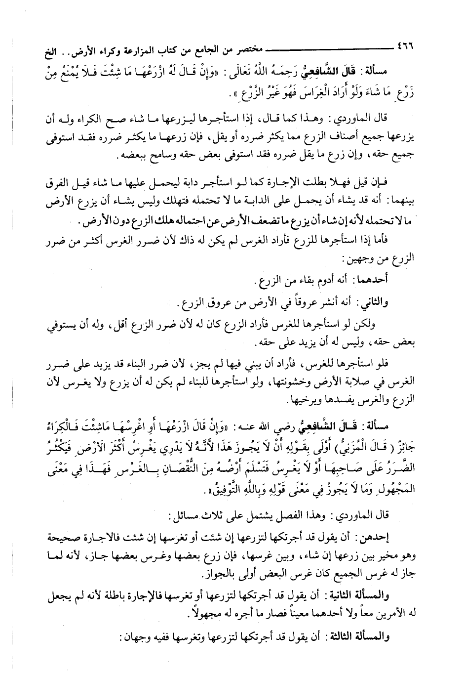 قال الشافعي رضي الله عنه: " وَإِنْ قَالَ ازْرَعْهَا أَوِ اغْرِسْهَا مَا شِئْتَ فَالْكِرَاءُ جائزٌ (قَالَ الْمُزَنِيُّ) أَوْلَى بِقَوْلِهِ أَنْ لَا يَجُوزَ هَذَا لِأَنَّهُ لَا يَدْرِي يَغْرِسُ أَكْثَرَ الْأَرْضِ فَيَكْثُرُ الضَّرَرُ عَلَى صَاحِبِهَا أَوْ لَا يَغْرِسُ فَتَسْلَمُ أَرْضُهُ مِنَ النُّقْصَانِ بِالْغَرْسِ فَهَذَا فِي مَعْنَى الْمَجْهُولِ وَمَا لَا يَجُوزُ فِي مَعْنَى قَوْلِهِ وَبِاللَّهِ التَّوْفِيقُ.