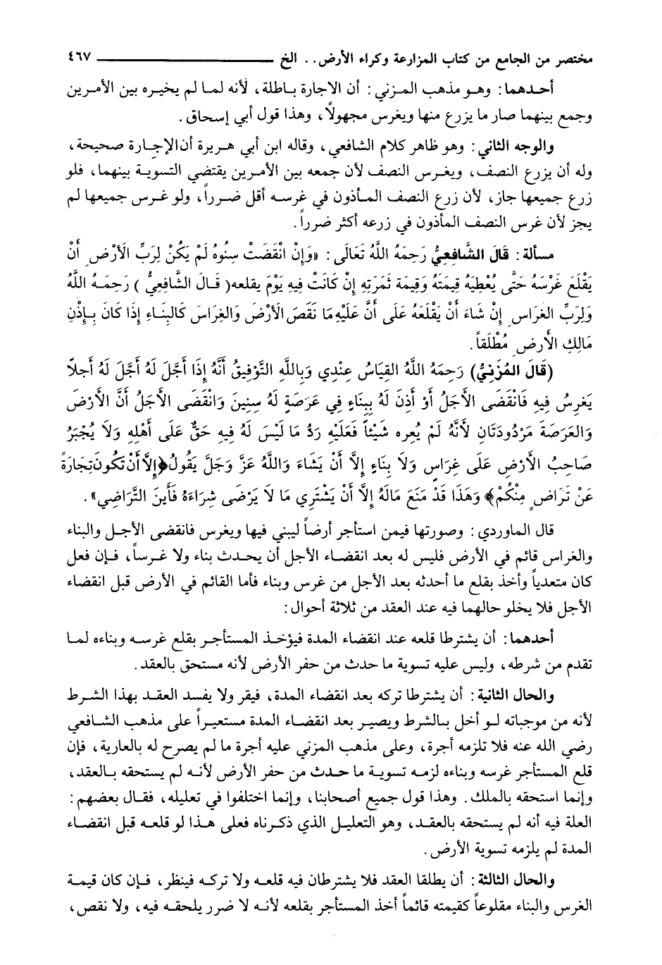 قال الشافعي رحمه الله تعالى: " وَإِنِ انْقَضَتْ سِنُوهُ لَمْ يَكُنْ لِرَبّ الْأَرْضِ أَنْ يَقْلَعَ غَرْسَهُ حَتَّى يُعْطِيَهُ قِيمَتَهُ وَقِيمَةَ ثَمَرَتِهِ إِنْ كَانَتْ فِيهِ يَوْمَ يَقْلَعُهُ (قَالَ الشَّافِعِيُّ) رَحِمَهُ اللَّهُ وَلِرَبِّ الْغِرَاسِ إِنْ شَاءَ أَنْ يَقْلَعَهُ عَلَى أَنَّ عَلَيْهِ مَا نَقَصَ الْأَرْضَ وَالْغِرَاس كَالْبِنَاءِ إِذَا كَانَ بِإِذْنِ مَالِكِ الأرض مطلقاً. (قَالَ الْمُزَنِيُّ) رَحِمَهُ اللَّهُ الْقِيَاسُ عِنْدِي وَبِاللَّهِ التوفيق أنه إذا أجل له أَجَّلَ لَهُ أَجَلًا يَغْرِسُ فِيهِ فَانْقَضَى الْأَجَلُ أَوْ أَذِنَ لَهُ ببناءٍ فِي عرصةٍ لَهُ سِنِينَ وَانْقَضَى الْأَجَلُ أَنَّ الْأَرْضَ وَالْعَرْصَةَ مَرْدُودَتَانِ لِأَنَّهُ لَمْ يُعِرْهُ شَيْئًا فَعَلَيْهِ رَدُّ مَا لَيْسَ لَهُ فِيهِ حَقٌّ عَلَى أَهْلِهِ وَلَا يُجْبَرُ صَاحِبُ الْأَرْضِ عَلَى غراسٍ وَلَا بناءٍ إِلَّا أَنْ يَشَاءَ وَاللَّهُ عَزَّ وَجَلَ يَقُولُ {إلاَّ أَنْ تَكُونَ تِجَارَةً عَنْ تَراضٍ مِنْكُمْ} وَهَذَا قَدْ مَنَعَ مَالَهُ إِلَّا أَنْ يَشْتَرِيَ مَا لَا يَرْضَى شِرَاءَهُ فَأَيْنَ التَّرَاضِي ".