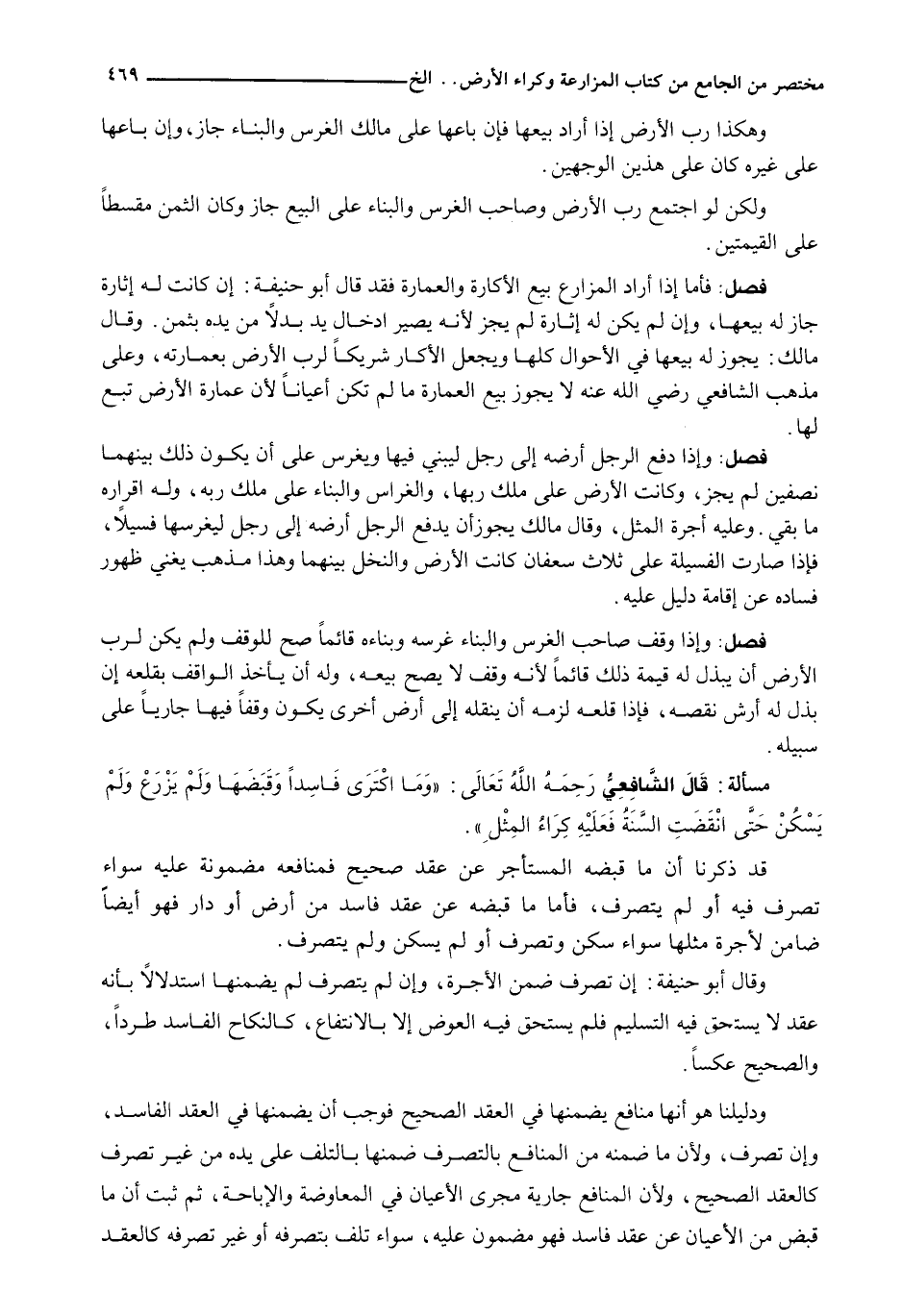 قَدْ ذَكَرْنَا أَنَّ مَا قَبَضَهُ الْمُسْتَأْجِرُ عَنْ عَقْدٍ صَحِيحٍ فَمَنَافِعُهُ مَضْمُونَةٌ عَلَيْهِ سَوَاءٌ تَصَرَّفَ فِيهِ أَوْ لَمْ يَتَصَرَّفْ، فَأَمَّا مَا قَبَضَهُ عَنْ عَقْدٍ فَاسِدٍ مِنْ أَرْضٍ أَوْ دَارٍ فهو أيضاً ضامن لأجرة مِثْلِهَا سَوَاءٌ سَكَنَ وَتَصَرَّفَ أَوْ لَمْ يَسْكُنْ وَلَمْ يَتَصَرَّفْ.