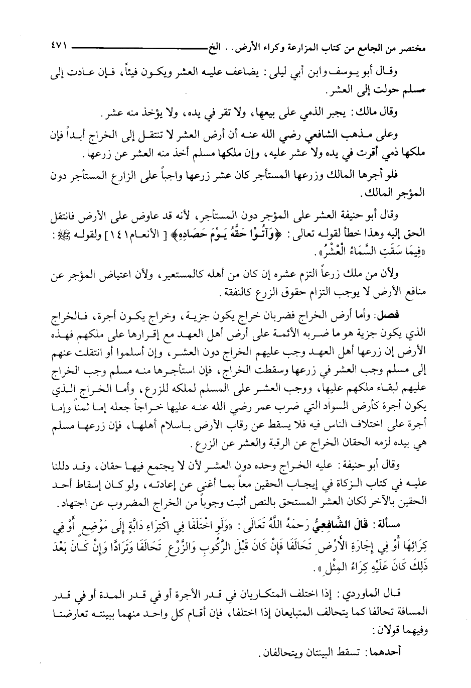 : وَأَمَّا أَرْضُ الْخَرَاجِ فَضَرْبَانِ خَرَاجٌ يَكُونُ جِزْيَةً، وَخَرَاجٌ يَكُونُ أُجْرَةً، فَالْخَرَاجُ الَّذِي يَكُونُ جِزْيَةً هُوَ مَا ضَرَبَهُ الْأَئِمَّةُ عَلَى أَرْضِ أَهْلِ الْعَهْدِ مَعَ إِقْرَارِهَا عَلَى مِلْكِهِمْ فَهَذِهِ الْأَرْضُ إِنْ زَرَعَهَا أَهْلُ الْعَهْدِ وَجَبَ عَلَيْهِمِ الْخَرَاجُ دُونَ الْعُشْرِ، وَإِنْ أَسْلَمُوا أَوِ انْتَقَلَتْ عَنْهُمْ إِلَى مُسْلِمٍ وَجَبَ الْعُشْرُ فِي زَرْعِهَا وَسَقَطَت الْخَرَاجُ، فَإِنِ اسْتَأْجَرَهَا مِنْهُ مُسْلِمٌ وَجَبَ الْخَرَاجُ عَلَيْهِمْ لِبَقَاءِ مِلْكِهِمْ عَلَيْهَا، وَوَجَبَ الْعُشْرُ عَلَى الْمُسْلِمِ لِمِلْكِهِ لِلزَّرْعِ، وَأَمَّا الْخَرَاجُ الذي يكون أجرة كأرض السواء الَّتِي ضَرَبَ عُمَرُ رَضِيَ اللَّهُ عَنْهُ عَلَيْهَا خَرَاجًا جَعَلَهُ إِمَّا ثَمَنًا وَإِمَّا أُجْرَةً عَلَى اخْتِلَافِ النَّاسِ فِيهِ فَلَا يَسْقُطُ عَنْ رِقَابِ الْأَرْضِ بِإِسْلَامِ أَهْلِهَا، فَإِنْ زَرَعَهَا مُسْلِمٌ هِيَ بِيَدِهِ لَزِمَهُ الْحَقَّانِ الْخَرَاجُ عَنِ الرَّقَبَةِ وَالْعُشْرُ عَنِ الزَّرْعِ.