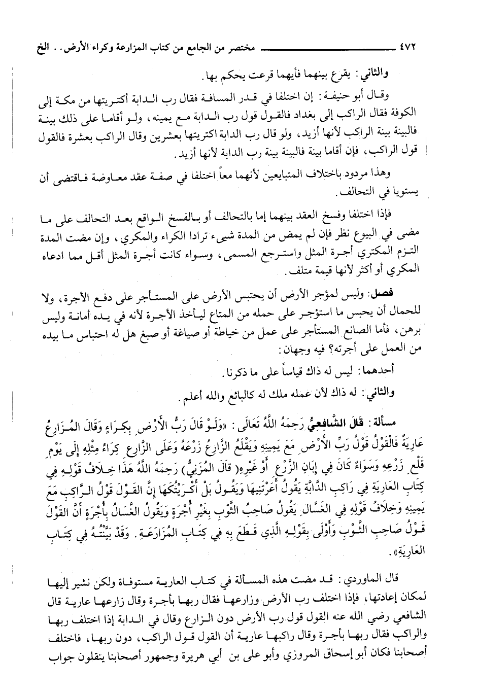 قَالَ الشافعي رحمه الله تعالى: " وَلَوْ قَالَ رَبُّ الْأَرْضِ بكراءٍ وَقَالَ الْمُزَارِعُ عاريةٌ فَالْقَوْلُ قَوْلُ رَبِّ الْأَرْضِ مَعَ يَمِينِهِ وَيَقْلَعُ الزَّارِعُ زَرْعَهُ وَعَلَى الزَّارِعِ كِرَاءُ مِثْلِهِ إِلَى يَوْمِ قَلْعِ زَرْعِهِ وَسَوَاءٌ كَانَ فِي إِبَانِ الزَّرْعِ أَوْ غَيْرِهِ (قَالَ الْمُزَنِيُّ) رَحِمَهُ اللَّهُ هَذَا خِلَافُ قَوْلِهِ فِي كِتَابِ الْعَارِيَةِ فِي رَاكِبِ الدَّابَّةِ يَقُولُ أَعَرْتَنِيهَا وَيَقُولُ بَلْ أَكْرَيْتُكَهَا إِنَّ الْقَوْلَ قَوْلُ الرَّاكِبِ مَعَ يَمِينِهِ وَخِلَافُ قَوْلِهِ فِي الْغَسَّالِ يَقُولُ صَاحِبُ الثَّوْبِ يغر أجرةٍ وَيَقُولُ الْغسالُ بأجرةٍ أَنَّ الْقَوْلَ قَوْلُ صَاحِبِ الثَّوْبِ وَأَوْلَى بِقَوْلِهِ الَّذِي قَطَعَ بِهِ في كتاب المزارعة. وقد بينه فِي كِتَابِ الْعَارِيَةِ ".