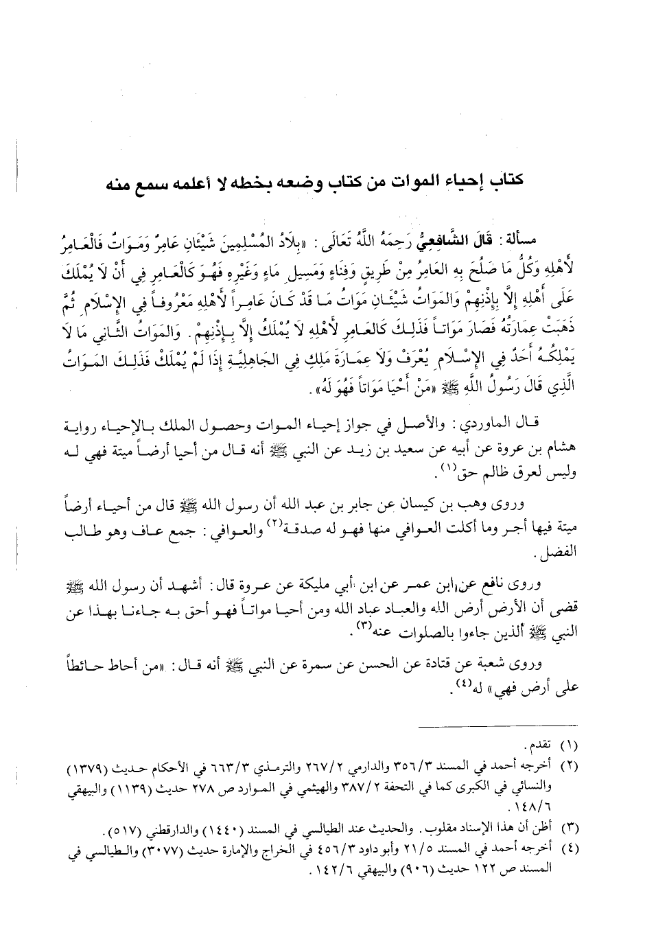 قال الشافعي رحمه الله تعالى: " بِلَادُ الْمُسْلِمِينَ شَيْئَانِ عامرٌ ومواتٌ فَالْعَامِرُ لِأَهْلِهِ وَكُلُّ مَا صَلَحَ بِهِ الْعَامِرُ مِنْ طريقٍ وفناءٍ وَمَسِيلِ ماءٍ وَغَيْرِهِ فَهُوَ كَالْعَامِرِ فِي أَنْ لَا يُمْلَكَ عَلَى أَهْلِهِ إِلَّا بِإِذْنِهِمْ وَالْمَوَاتُ شَيْئَانِ مَوَاتُ مَا قَدْ كَانَ عَامِرًا لِأَهْلِهِ مَعْرُوفًا فِي الْإِسْلَامِ ثُمَّ ذَهَبَتْ عِمَارَتُهُ فَصَارَ مَوَاتًا فَذَلِكَ كَالْعَامِرِ لِأَهْلِهِ لَا يُمْلَكُ إِلَّا بِإِذْنِهِمْ. وَالْمَوَاتُ الثَّانِي مَا لَا يَمْلِكُهُ أحدٌ فِي الْإِسْلَامِ يُعْرَفْ وَلَا عِمَارَةَ مِلْكٍ فِي الْجَاهِلِيَّةِ إِذَا لَمْ يُمْلَكْ فَذَلِكَ الْمَوَاتُ الَّذِي قَالَ رَسُولُ اللَّهِ - صَلَّى اللَّهُ عَلَيْهِ وَسَلَّم َ - " مَنْ أَحْيَا مَوَاتًا فَهُوَ لَهُ ".