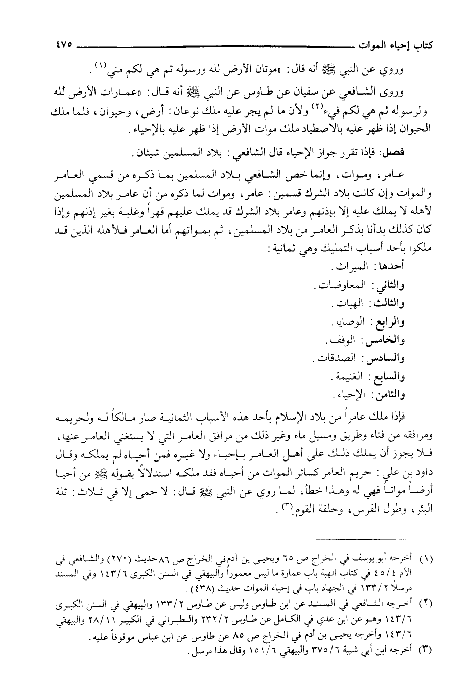 : فَإِذَا تَقَرَّرَ جَوَازُ الْإِحْيَاءِ قَالَ الشَّافِعِيُّ: بِلَادُ الْمُسْلِمِينَ شيئان عامر وموات ونما خَصَّ الشَّافِعِيُّ بِلَادَ الْمُسْلِمِينَ بِمَا ذَكَرَهُ مِنْ قِسْمَيِ الْعَامِرِ وَالْمَوَاتِ وَإِنْ كَانَتْ بِلَادُ الشِّرْكِ قِسْمَيْنِ: عَامِرٌ، وَمُوَاتٌ لِمَا ذَكَرَهُ مِنْ أَنَّ عَامِرَ بِلَادِ الْمُسْلِمِينَ لِأَهْلِهِ لَا يُمْلَكُ عَلَيْهِ إِلَّا بِإِذْنِهِمْ وَعَامِرَ بِلَادِ الشِّرْكِ قَدْ يُمْلَكُ عَلَيْهِمْ قَهْرًا وَغَلَبَةً بِغَيْرِ إِذْنِهِمْ وَإِذَا كَانَ كَذَلِكَ بَدَأْنَا بِذِكْرِ الْعَامِرِ مِنْ بِلَادِ الْمُسْلِمِينَ، ثُمَّ بِمَوَاتِهِمْ أَمَّا الْعَامِرُ فَلِأَهْلِهِ الَّذِينَ قَدْ مَلَكُوا بِأَحَدِ أَسْبَابِ التَّمْلِيكِ وَهِيَ ثَمَانِيَةٌ:
