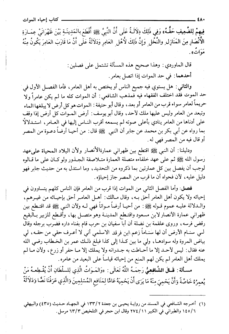 وَالثَّانِي: هَلْ يَسْتَوِي فِيهِ جَمِيعُ النَّاسِ أَوْ يَخْتَصُّ بِهِ أَهْلُ الْعَامِرِ، فَأَمَّا الْفَصْلُ الْأَوَّلُ فِي حَدِّ الْمَوْتِ فَقَدِ اخْتَلَفَ الْفُقَهَاءُ فِيهِ فَمَذْهَبُ الشَّافِعِيِّ: أَنَّ الْمَوَاتَ كُلَّهُ مَا لَمْ يَكُنْ عَامِرًا، وَلَا حَرِيمًا لِعَامِرٍ سَوَاءٌ قَرُبَ مِنَ الْعَامِرِ أَوْ بَعُدَ، وَقَالَ أبو حنيفة: الْمَوَاتُ هُوَ كُلُّ أَرْضٍ لَا يَبْلُغُهَا الْمَاءُ وَتَبْعُدُ مِنَ الْعَامِرِ وَلَيْسَ عَلَيْهَا مِلْكٌ لِأَحَدٍ، وَقَالَ أبو يوسف: أَرْضُ الْمَوَاتِ كُلُّ أَرْضٍ إِذَا وُقِفَ عَلَى أَدْنَاهَا مِنَ الْعَامِرِ يُنَادِي بِأَعْلَى صَوْتِهِ لَمْ يَسْمَعْهُ أَقْرَبُ النَّاسِ إِلَيْهَا فِي الْعَامِرِ، اسْتِدْلَالًا بِمَا رَوَاهُ عَنْ أَبِي بَكْرِ بْنِ مُحَمَّدٍ عَنْ جَابِرٍ أَنَّ النَّبِيَّ - صَلَّى اللَّهُ عَلَيْهِ وَسَلَّم َ - قَالَ: مَنْ أَحْيَا أَرْضًا دَعْوَةً مِنَ الْمِصْرِ أَوْ قَالَ فِيهِ مِنَ الْمِصْرِ فَهِيَ لَهُ.