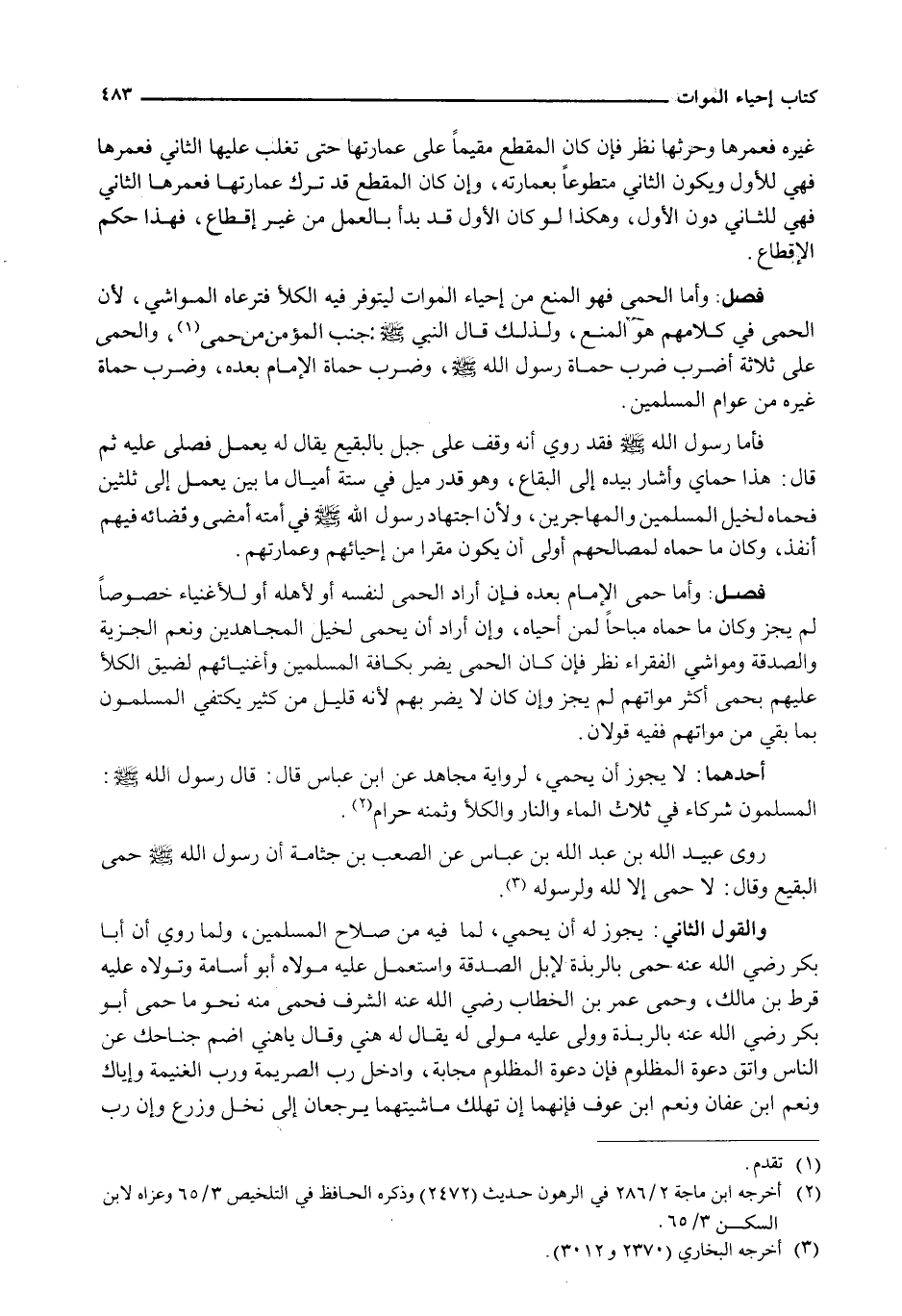: وَأَمَّا حِمَى الْإِمَامِ بَعْدَهُ فَإِنْ أَرَادَ الْحِمَى لِنَفْسِهِ أَوْ لِأَهْلِهِ أَوْ لِلْأَغْنِيَاءِ خُصُوصًا لَمْ يَجُزْ وَكَانَ مَا حَمَاهُ مُبَاحًا لِمَنْ أَحْيَاهُ، وَإِنْ أَرَادَ أَنْ يَحْمِيَ لِخَيْلِ الْمُجَاهِدِينَ وَنَعَمِ الْجِزْيَةِ وَالصَّدَقَةِ وَمَوَاشِي الْفُقَرَاءِ نُظِرَ فَإِنْ كَانَ الْحِمَى يَضُرُّ بِكَافَّةِ الْمُسْلِمِينَ وَأَغْنِيَائِهِمْ لِضِيقِ الْكَلَأِ عَلَيْهِمْ بِحِمَى أَكْثَرِ مَوَاتِهِمْ لَمْ يَجُزْ وَإِنْ كَانَ لَا يَضُرُّ بِهِمْ لِأَنَّهُ قَلِيلٌ مِنْ كَثِيرٍ يَكْتَفِي الْمُسْلِمُونَ بِمَا بَقِيَ مِنْ مَوَاتِهِمْ فَفِيهِ قَوْلَانِ: