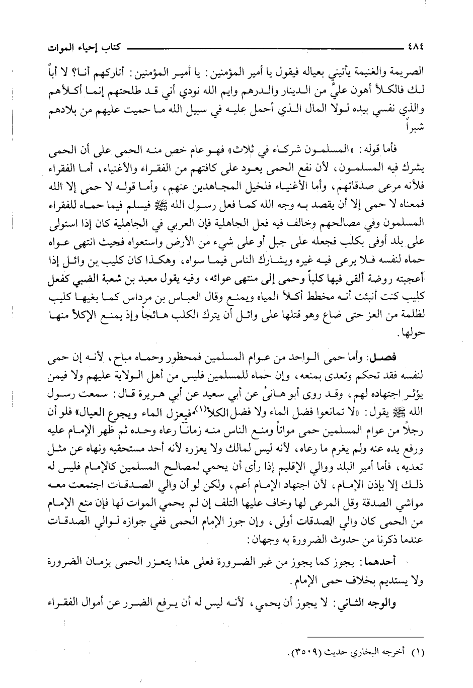 فَأَمَّا قَوْلُهُ: " الْمُسْلِمُونَ شُرَكَاء فِي ثَلَاثٍ " فَهُوَ عَامٌّ خَصَّ مِنْهُ الْحِمَى عَلَى أَنَّ الْحِمَى يُشْرَكُ فِيهِ الْمُسْلِمُونَ، لِأَنَّ نَفْعَ الْحِمَى يَعُودُ عَلَى كَافَّتِهِمْ مِنَ الْفُقَرَاءِ وَالْأَغْنِيَاءِ، أَمَّا الْفُقَرَاءُ فَلِأَنَّهُ مَرْعَى صَدَقَاتِهِمْ، وَأَمَّا الْأَغْنِيَاءُ فَلِخَيْلِ الْمُجَاهِدِينَ عَنْهُمْ، وَأَمَّا قوله لا حمى إلا الله فَمَعْنَاهُ لَا حِمَى إِلَّا أَنْ يُقْصَدَ بِهِ وَجْهُ اللَّهِ كَمَا فَعَلَ رَسُولُ اللَّهِ - صَلَّى اللَّهُ عَلَيْهِ وَسَلَّم َ - فيسلم فيما حماه للفقراء المسلمون وفي مصالحهم وخالفاً فِيهِ فِعْلَ الْجَاهِلِيَّةِ فَإِنَّ الْعَرَبِيَّ فِي الْجَاهِلِيَّةِ كان إذا استولى على بلد أوفى بكلب فَجَعَلَهُ عَلَى جَبَلٍ أَوْ عَلَى شَيْءٍ مِنَ الْأَرْضِ وَاسْتَعْوَاهُ فَحَيْثُ انْتَهَى عُوَاهُ حَمَاهُ لِنَفْسِهِ فَلَا يَرْعَى فِيهِ غَيْرُهُ وَيُشَارِكُ النَّاسَ فِيمَا سِوَاهُ، وَهَكَذَا كَانَ كُلَيْبُ بْنُ وَائِلٍ إِذَا أعجبته روضة ألقى فيها كلباً وَحَمَى إِلَى مُنْتَهَى عُوَائِهِ، وَفِيهِ يَقُولُ مَعْبَدُ بْنُ شُعْبَةَ الضَّبِّيُّ كَفِعْلِ كُلَيْبٍ كُنْتُ أُنْبِئْتُ أَنَّهُ مُخَطَّطٌ أَكَلَأَ الْمِيَاهَ وَيَمْنَعُ وَقَالَ الْعَبَّاسُ بْنُ مِرْدَاسٍ كَمَا بَغِيَهَا كُلَيْبٌ لِظُلْمَةٍ مِنَ الْعِزِّ حَتَّى ضَاعَ وَهُوَ قَتْلُهَا عَلَى وَائِلٍ أن يترك الكلب هائجاً وإذ يمنع الأكلأ مِنْهَا حَوْلَهَا.