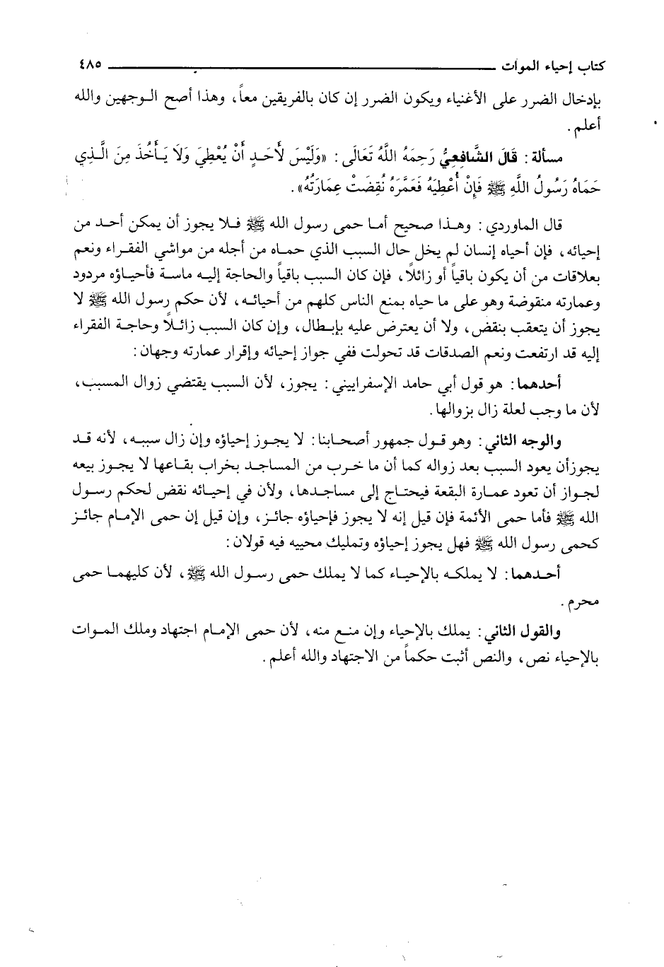 قَالَ الْمَاوَرْدِيُّ: وَهَذَا صَحِيحٌ أَمَّا حِمَى رَسُولِ اللَّهِ - صَلَّى اللَّهُ عَلَيْهِ وَسَلَّم َ - فَلَا يَجُوزُ أَنْ يُمَكَّنَ أَحَدٌ مِنْ إِحْيَائِهِ، فَإِنْ أَحْيَاهُ إِنْسَانٌ لَمْ يَخْلُ حَالُ السَّبَبِ الَّذِي حَمَاهُ مِنْ أَجْلِهِ مِنْ مَوَاشِي الْفُقَرَاءِ ونعم بعلاقات مِنْ أَنْ يَكُونَ بَاقِيًا أَوْ زَائِلًا فَإِنْ كَانَ السَّبَبُ بَاقِيًا وَالْحَاجَةُ إِلَيْهِ مَاسَّةً فَإِحْيَاؤُهُ مَرْدُودٌ وَعِمَارَتُهُ مَنْقُوضَةٌ وَهُوَ عَلَى مَا حَيَّاهُ بِمَنْعِ النَّاسِ كُلِّهِمْ مِنْ إِحْيَائِهِ، لِأَنَّ حُكْمَ رَسُولِ اللَّهِ - صَلَّى اللَّهُ عَلَيْهِ وَسَلَّم َ - لَا يَجُوزُ أَنْ يُتَعَقَّبَ بِنَقْضٍ، وَلَا أَنْ يُعْتَرَضَ عَلَيْهِ بِإِبْطَالٍ، وَإِنْ كَانَ السَّبَبُ زَائِلًا وَحَاجَةُ الْفُقَرَاءِ إِلَيْهِ قَدِ ارْتَفَعَتْ وَنَعَمُ الصَّدَقَاتِ قَدْ تَحَوَّلَتْ فَفِي جَوَازِ إِحْيَائِهِ وَإِقْرَارِ عِمَارَتِهِ وَجْهَانِ: