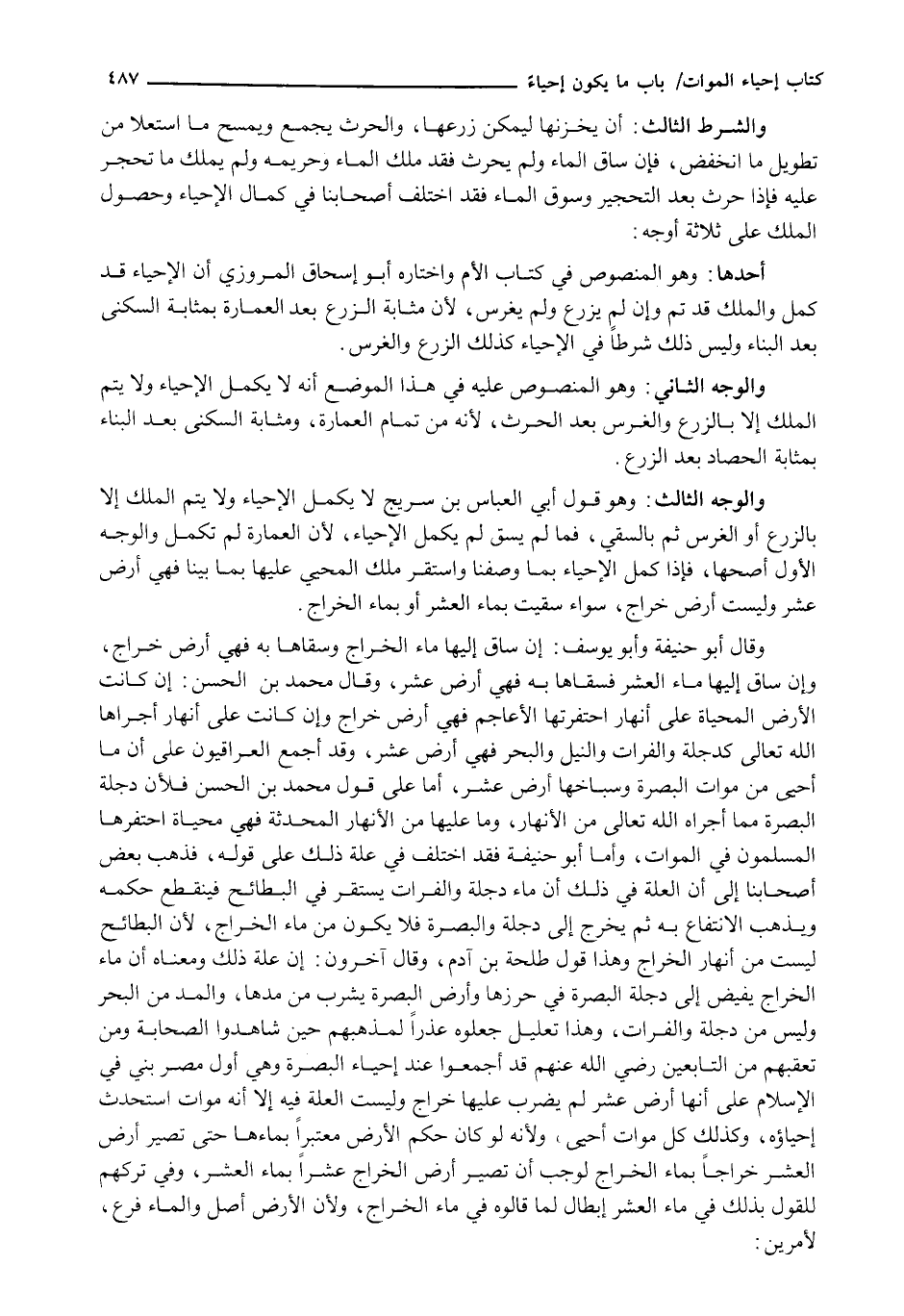 وَالْوَجْهُ الثَّالِثُ: وَهُوَ قَوْلُ أَبِي الْعَبَّاسِ بْنِ سُرَيْجٍ لَا يَكْمُلُ الْإِحْيَاءُ وَلَا يَتِمُّ الْمِلْكُ إِلَّا بِالزَّرْعِ أَوِ الْغَرْسِ ثُمَّ بِالسَّقْيِ، فَمَا لَمْ يُسْقَ لَمْ يَكْمُلِ الْإِحْيَاءُ، لِأَنَّ الْعِمَارَةَ لَمْ تَكْمُلْ وَالْوَجْهُ الْأَوَّلُ أَصَحُّهَا، فَإِذَا كَمُلَ الْإِحْيَاءُ بِمَا وَصَفْنَا وَاسْتَقَرَّ مِلْكُ الْمُحْيِي عَلَيْهَا بِمَا بَيَّنَّا فَهِيَ أَرْضُ عُشْرٍ وَلَيْسَتْ أَرْضَ خَرَاجٍ، سَوَاءٌ سُقِيَتْ بِمَاءِ الْعُشْرِ أَوْ بِمَاءِ الْخَرَاجِ.