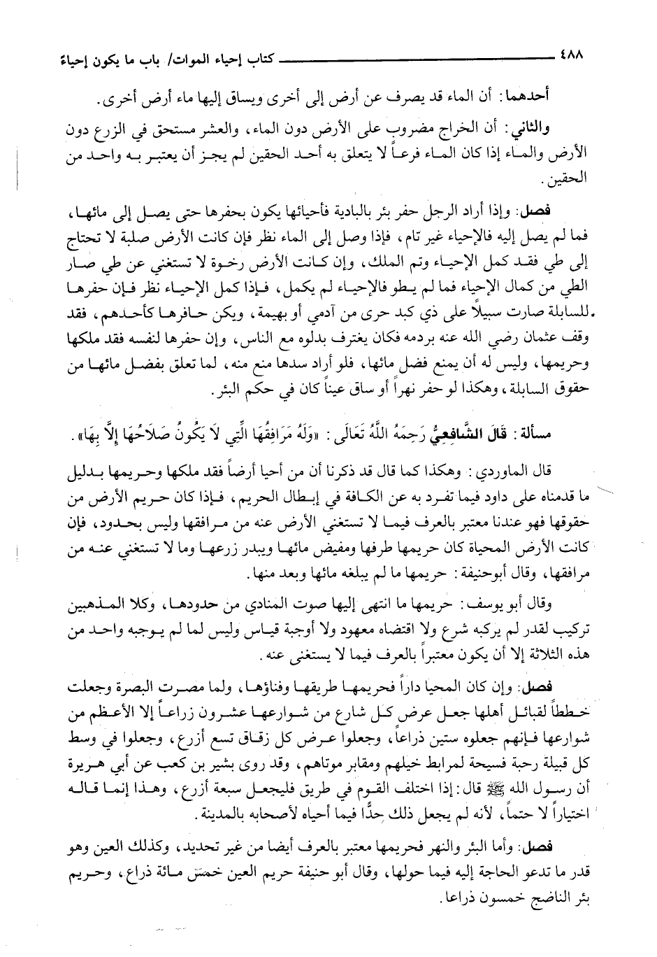 : وَإِنْ كَانَ الْمُحَيَّا دَارًا فَحَرِيمُهَا طَرِيقُهَا وَفِنَاؤُهَا، وَلما مُصِّرَتِ الْبَصْرَةُ وَجُعِلَتْ خُطَطًا لِقَبَائِلِ أَهْلِهَا جُعِلَ عَرْضُ كُلِّ شَارِعٍ مِنْ شوارعها عشرون زراعاً إِلَّا الْأَعْظَمَ مِنْ شَوَارِعِهَا فَإِنَّهُمْ جَعَلُوهُ سِتِّينَ ذراعاً، وجعلوا عرض كل زقاق تسع أزرع، وَجَعَلُوا فِي وَسَطِ كُلِّ قَبِيلَةٍ رَحَبَةً فَسِيحَةً لِمَرَابِطِ خَيْلِهِمْ وَمَقَابِرِ مَوْتَاهُمْ، وَقَدْ رَوَى بَشِيرُ بْنُ كَعْبٍ عَنْ أَبِي هُرَيْرَةَ أَنَّ رَسُولَ اللَّهِ - صَلَّى اللَّهُ عَلَيْهِ وَسَلَّم َ - قَالَ: إِذَا اخْتَلَفَ الْقَوْمُ فِي طَرِيقٍ فَلْيُجْعَلْ سبعة أزرع، وَهَذَا إِنَّمَا قَالَهُ اخْتِيَارًا لَا حَتْمًا، لِأَنَّهُ لَمْ يَجْعَلْ ذَلِكَ حَدًّا فِيمَا أَحْيَاهُ لِأَصْحَابِهِ بِالْمَدِينَةِ.