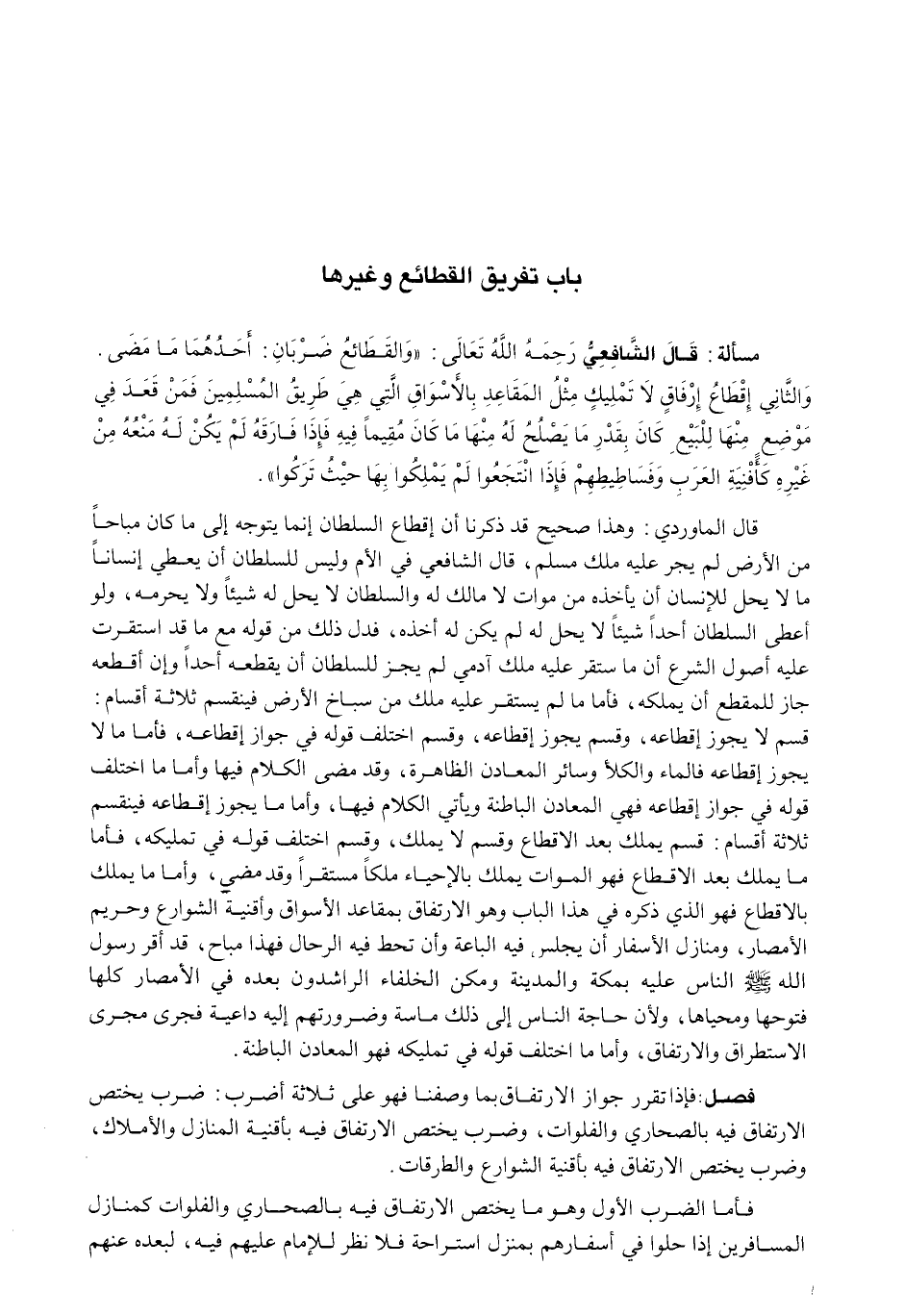 قَالَ الْمَاوَرْدِيُّ: وَهَذَا صَحِيحٌ قَدْ ذَكَرْنَا أَنَّ إِقْطَاعَ السُّلْطَانِ إِنَّمَا يَتَوَجَّهُ إِلَى مَا كَانَ مُبَاحًا مِنَ الْأَرْضِ لَمْ يَجْرِ عَلَيْهِ مِلْكُ مُسْلِمٍ، قَالَ الشَّافِعِيُّ فِي الْأُمِّ وَلَيْسَ لِلسُّلْطَانِ أَنْ يُعْطِيَ إِنْسَانًا مَا لَا يَحِلُّ لِلْإِنْسَانِ أَنْ يَأْخُذَهُ مِنْ مَوَاتٍ لَا مَالِكَ لَهُ وَالسُّلْطَانُ لَا يُحِلُّ لَهُ شَيْئًا وَلَا يُحَرِّمُهُ، وَلَوْ أَعْطَى السُّلْطَانُ أَحَدًا شَيْئًا لَا يَحِلُّ لَهُ لَمْ يَكُنْ لَهُ أَخْذُهُ، فَدَلَّ ذَلِكَ مِنْ قَوْلِهِ مَعَ مَا قَدِ استقرت عليه أصول الشرع أن ما ستقر عَلَيْهِ مِلْكُ آدَمِيٍّ لَمْ يَجُزْ لِلسُّلْطَانِ أَنْ يُقْطِعَهُ أَحَدًا وَإِنْ أَقْطَعهُ جَازَ لِلْمُقطعِ أَنْ يَمْلِكَهُ، فَأَمَّا مَا لَمْ يَسْتَقِر عَلَيْهِ مِلْكٌ مِنْ سِبَاخِ الْأَرْضِ فَيَنْقَسِمُ ثَلَاثَةَ أَقْسَامٍ: قِسْمٌ لَا يَجُوزُ إِقْطَاعُهُ، وَقِسْمٌ يَجُوزُ إِقْطَاعُهُ، وَقِسْمٌ اخْتَلَفَ قَوْلُهُ فِي جَوَازِ إِقْطَاعِهِ، فَأَمَّا مَا لا يجوز إقاطعه فَالْمَاءُ وَالْكَلَأُ وَسَائِرُ الْمَعَادِنِ الظَّاهِرَةِ، وَقَدْ مَضَى الْكَلَامُ فِيهَا وَأَمَّا مَا اخْتَلَفَ قَوْلُهُ فِي جَوَازِ إِقْطَاعِهِ فَهِيَ الْمَعَادِنُ الْبَاطِنَةُ وَيَأْتِي الْكَلَامُ فِيهَا، وَأَمَّا مَا يَجُوزُ إِقْطَاعُهُ فَيَنْقَسِمُ ثَلَاثَةَ أَقْسَامٍ: قِسْمٌ يُمْلَكُ بَعْدَ الْإِقْطَاعِ وَقِسْمٌ لَا يُمْلَكُ، وَقِسْمٌ اخْتَلَفَ قَوْلُهُ فِي تَمْلِيكِهِ، فَأَمَّا مَا يُمْلَكُ بَعْدَ الْإِقْطَاعِ فَهُوَ الْمَوَاتُ يُمْلَكُ بِالْإِحْيَاءِ مِلْكًا مُسْتَقِرًّا وَقَدْ مَضَى، وَأَمَّا مَا يُمْلَكُ بِالْإِقْطَاعِ فَهُوَ الَّذِي ذَكَرَهُ فِي هَذَا الْبَابِ وَهُوَ الِارْتِفَاقُ بِمَقَاعِدِ الْأَسْوَاقِ وَأَقْنِيَةِ الشَّوَارِعِ وَحَرِيمِ الْأَمْصَارِ، وَمَنَازِلِ الْأَسْفَارِ أَنْ يَجْلِسَ فِيهِ الْبَاعَةُ وَأَنْ تُحَطَّ فِيهِ الرِّحَالُ فَهَذَا مُبَاحٌ، قَدْ أَقَرَّ رَسُولُ اللَّهِ - صَلَّى اللَّهُ عَلَيْهِ وَسَلَّم َ - الناس عليه بمكة والمدنيه وَمَكَّنَ الْخُلَفَاءُ الرَّاشِدُونَ بَعْدَهُ فِي الْأَمْصَارِ كُلِّهَا فُتُوحَهَا وَمُحَيَّاهَا، وَلِأَنَّ حَاجَةَ النَّاسِ إِلَى ذَلِكَ مَاسَّةٌ وَضَرُورَتَهُمْ إِلَيْهِ دَاعِيَةٌ فَجَرَى مَجْرَى الِاسْتِطْرَاقِ وَالِارْتِفَاقِ، وَأَمَّا مَا اخْتَلَفَ قَوْلُهُ فِي تَمْلِيكِهِ فهو المعادن الباطنة.