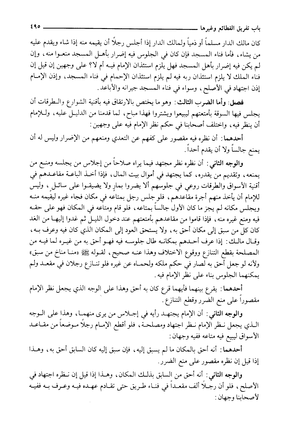 وَالْوَجْهُ الثَّانِي: أن نظره نظر مجتهد فيما يراه صلاحاً من إجلاس من يجلسه ومنع من يمنعه، وتقديم من يقدره، كما يجتهد في أموال بيت المال، فَإِذَا أَخَذَ الْبَاعَةُ مَقَاعِدَهُمْ فِي أَقْنِيَةِ الْأَسْوَاقِ وَالطُّرُقَاتِ رُوعِيَ فِي جُلُوسِهِمْ أَلَّا يَضُرُّوا بمارٍ وَلَا يُضَيِّقُوا عَلَى سائلٍ، وَلَيْسَ لِلْإِمَامِ أَنْ يَأْخُذَ مِنْهُمْ أُجْرَةَ مَقَاعِدِهِمْ، فَلَوْ جَلَسَ رَجُلٌ بِمَتَاعِهِ فِي مَكَانٍ فَجَاءَ غَيْرُهُ لِيُقِيمَهُ مِنْهُ وَيَجْلِسَ مَكَانَهُ لَمْ يَجُزْ مَا كَانَ الْأَوَّلُ جَالِسًا بِمَتَاعِهِ، فَلَوْ قَامَ وَمَتَاعُهُ فِي الْمَكَانِ فَهُوَ عَلَى حَقِّهِ فِيهِ وَمَنَعَ غَيْرَهُ مِنْهُ، فَإِذَا قَامُوا مِنْ مَقَاعِدِهِمْ بِأَمْتِعَتِهِمْ عِنْدَ دُخُولِ اللَّيْلِ ثُمَّ غَدَوْا إِلَيْهَا مِنَ الْغَدِ كَانَ كُلُّ مَنْ سَبَقَ إِلَى مَكَانٍ أَحَقَّ بِهِ، وَلَا يَسْتَحِقُّ الْعَوْدَ إِلَى الْمَكَانِ الَّذِي كَانَ فِيهِ وَعُرِفَ بِهِ، وَقَالَ مَالِكٌ: إِذَا عُرِفَ أَحَدُهُمْ بِمَكَانِهِ طَالَ جُلُوسُهُ فِيهِ فَهُوَ أَحَقُّ بِهِ مِنْ غَيْرِهِ لِمَا فِيهِ مِنَ الْمَصْلَحَةِ بِقَطْعِ التَّنَازُعِ وَوُقُوعِ الِاخْتِلَافِ وَهَذَا عَنْهُ صَحِيحٌ، لقوله - صَلَّى اللَّهُ عَلَيْهِ وَسَلَّم َ - " منا مُنَاخُ مَنْ سَبَقَ " وَلِأَنَّهُ لَوْ جُعِلَ أَحَقَّ بِهِ لَصَارَ فِي حُكْمِ مِلْكِهِ وَلِحِمَاهُ عَنْ غَيْرِهِ فَلَوْ تَنَازَعَ رَجُلَانِ فِي مَقْعَدٍ وَلَمْ يُمْكِنْهُمَا الْجُلُوسُ بِنَاءً عَلَى نَظَرِ الْإِمَامِ فِيهِ.
