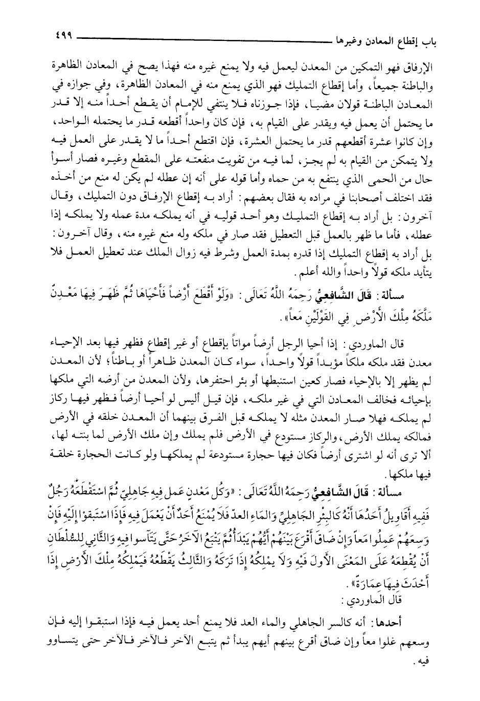 قَالَ الشافعي رحمه الله تعالى: " وَكُلُّ معدنٍ عَمِلَ فِيهِ جَاهِلِيٌّ ثُمَّ اسْتَقْطَعَهُ رجلٌ فَفِيهِ أَقَاوِيلُ أَحَدُهَا أَنْهُ كَالْبِئْرِ الْجَاهِلِيِّ وَالْمَاءِ الْعِدِّ فَلَا يُمْنَعُ أحدٌ أَنْ يَعْمَلَ فِيهِ فَإِذَا اسْتَبَقُوا إِلَيْهِ فَإِنْ وَسِعَهُمْ عَمِلُوا مَعًا وَإِنْ ضَاقَ أُقْرِعَ بَيْنَهُمْ أَيُّهُمْ يَبْدَأُ ثم يتبع الآخر حَتَّى يَتَآسَوْا فِيهِ وَالثَّانِي لِلسُّلْطَانِ أَنْ يُقْطِعَهُ عَلَى الْمَعْنَى الْأَوَّلِ فَيْهِ وَلَا يَمْلِكَهُ إِذَا تَرَكَهُ وَالثَّالِثُ يَقْطَعُهُ فَيَمْلِكُهُ مِلْكَ الْأَرْضِ إِذَا أحدث فيها عمارة ".