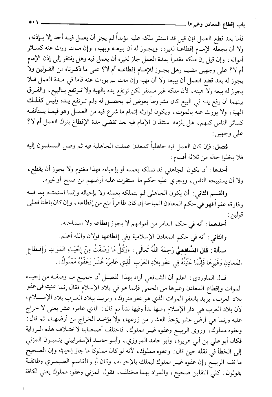 قَالَ الْمَاوَرْدِيُّ: اعْلَمْ أَنَّ الشَّافِعِيَّ أَرَادَ بِهَذَا الْفَصْلِ أَنَّ جَمِيعَ مَا وَصَفَهُ مِنْ إِحْيَاءِ الْمَوَاتِ وَإِقْطَاعِ الْمَعَادِنِ وَغَيْرِهَا مِنَ الْحِمَى فَإِنَّمَا هُوَ فِي بِلَادِ الْإِسْلَامِ فَقَالَ إِنَّمَا عَنَيْتُهُ فِي عَفْوِ بِلَادِ الْعَرَبِ، يُرِيدُ بِالْعَفْوِ الْمَوَاتَ الَّذِي هُوَ عَفْوٌ مَتْرُوكٌ، وَيُرِيدُ بِبِلَادِ الْعَرَبِ بِلَادَ الْإِسْلَامِ، لِأَنَّ بِلَادَ الْعَرَبِ هِيَ دَارُ الْإِسْلَامِ وَمِنْهَا بَدَأَ وَفِيهَا نَشَأَ ثُمَّ قَالَ: الَّذِي عَامِرُهُ عُشْرٌ يَعْنِي لَا خَرَاجَ عَلَيْهِ وَإِنَّمَا هِيَ أَرْضُ عُشْرٍ يُؤْخَذُ الْعُشْرُ مِنْ زَرْعِهَا، وَلَا يُؤْخَذُ الْخَرَاجُ مِنْ أَرْضِهَا، ثُمَّ قَالَ: وَعَفْوُهُ مَمْلُوكٌ، وَرَوَى الرَّبِيعُ وَعَفْوُهُ غَيْرُ مَمْلُوكٍ، فَاخْتَلَفَ أَصْحَابُنَا لِاخْتِلَافِ هَذِهِ الرِّوَايَةِ فَكَانَ أَبُو عَلِيِّ بْنُ أَبِي هُرَيْرَةَ، وَأَبُو حَامِدٍ الْمَرْوَزِيُّ، وَأَبُو حَامِدٍ الْإِسْفَرَايِينِيُّ يَنْسُبُونَ الْمُزَنِيَّ إِلَى الْخَطَأِ فِي نَقْلِهِ حِينَ قَالَ: وَعَفْوُهُ مَمْلُوكٌ، لِأَنَّهُ لَوْ كَانَ مَمْلُوكًا مَا جَازَ إِحْيَاؤُهُ وَإِنَّ الصحيح ما نقله الربيع وإن عفوه غير مَمْلُوك لِيُمْلَكَ بِالْإِحْيَاءِ، وَكَانَ أَبُو الْقَاسِمِ الصَّيْمَرِيُّ وطائفة يقولون: كلي النَّقْلَيْنِ صَحِيحٌ، وَالْمُرَادُ بِهِمَا مُخْتَلِفٌ، فَقَوْلُ الْمُزَنِيِّ وَعَفْوُهُ مَمْلُوكٌ يَعْنِي لِكَافَّةِ