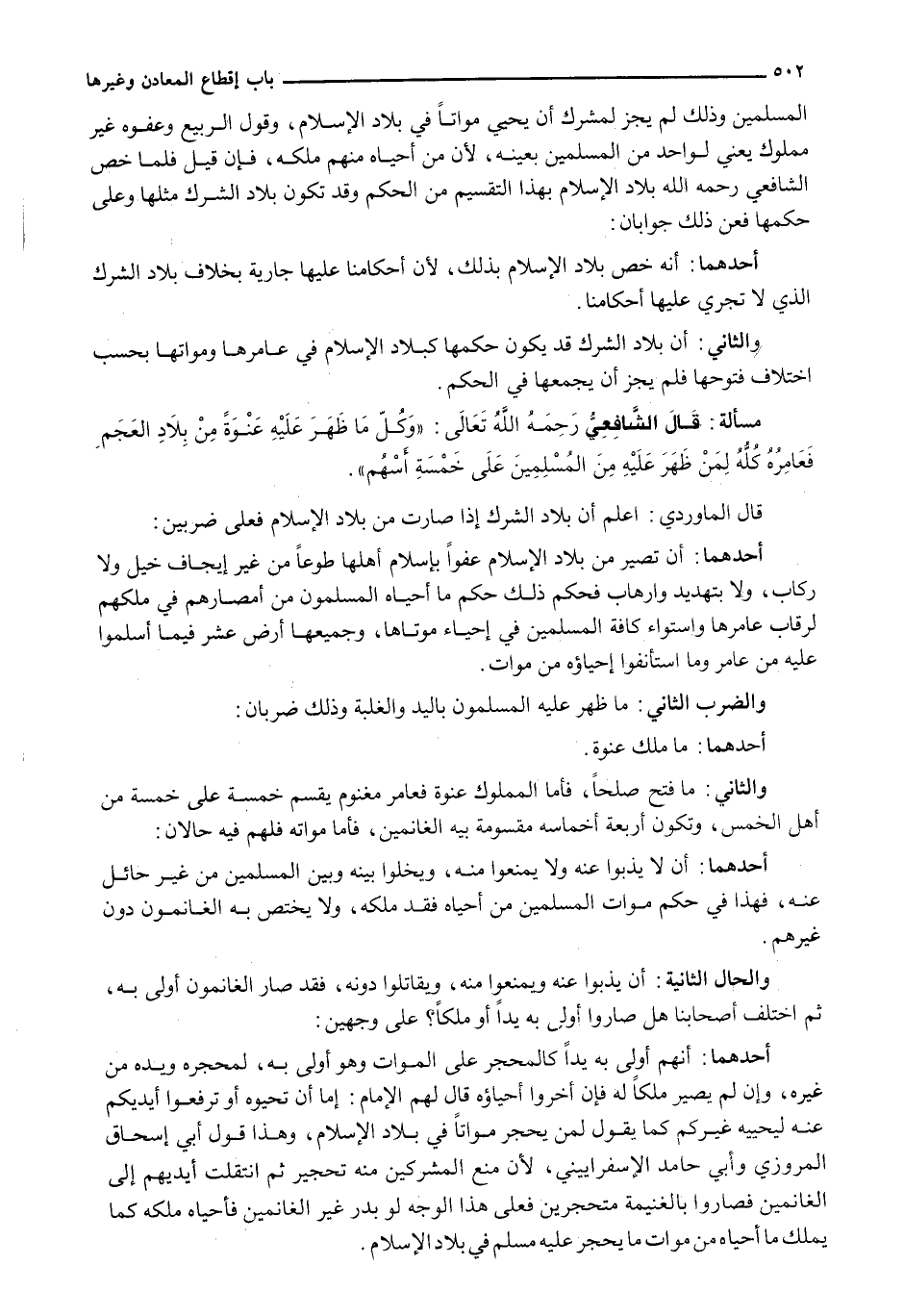 الْمُسْلِمِينَ وَذَلِكَ لَمْ يَجُزْ لِمُشْرِكٍ أَنْ يُحْيِيَ مَوَاتًا فِي بِلَادِ الْإِسْلَامِ، وَقَوْلُ الرَّبِيعِ وَعَفْوُهُ غَيْرُ مَمْلُوكٍ يَعْنِي لِوَاحِدٍ مِنَ الْمُسْلِمِينَ بِعَيْنِهِ، لِأَنَّ مَنْ أَحْيَاهُ مِنْهُمْ مَلَكَهُ، فَإِنْ قِيلَ فلما خَصَّ الشَّافِعِيُّ رَحِمَهُ اللَّهُ بِلَادَ الْإِسْلَامِ بِهَذَا التَّقْسِيمِ مِنَ الْحُكْمِ وَقَدْ تَكُونُ بِلَادُ الشِّرْكِ مِثْلَهَا وَعَلَى حُكْمِهَا فَعَنْ ذَلِكَ جَوَابَانِ: