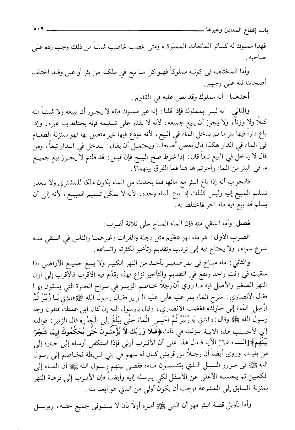 وَالثَّانِي: مَاءٌ مُبَاحٌ فِي نَهْرٍ صَغِيرٍ يَأْخُذُ مِنَ النَّهْرِ الْكَبِيرِ وَلَا يَسْعُ جَمِيعَ الْأَرَاضِي إِذَا سُقِيَتْ فِي وَقْتٍ وَاحِدٍ وَيَقَعُ فِي التَّقْدِيمِ وَالتَّأْخِيرِ نِزَاعٌ فَهَذَا يُقَدَّمُ فِيهِ الْأَقْرَبُ فَالْأَقْرَبُ إِلَى أَوَّلِ النَّهْرِ الصَّغِيرِ وَالْأَصْلُ فِيهِ مَا رُوِيَ أَنَّ رَجُلًا خَاصَمَ الزُّبَيْرَ فِي سَرَاحِ الْحُرَّةِ الَّتِي يَسْقُونَ بِهَا فَقَالَ الْأَنْصَارِيُّ: سَرَحُ الْمَاءِ يَمُرُّ عَلَيْهِ فَأَبَى عَلَيْهِ الزُّبَيْرُ فَقَالَ رَسُولُ اللَّهِ - صَلَّى اللَّهُ عَلَيْهِ وَسَلَّم َ - " اسْقِ يَا زُبَيْرُ ثُمَّ أَرْسِلِ الْمَاءَ إِلَى جَارِكَ " فَغَضِبَ الْأَنْصَارِيُّ، وَقَالَ يَا رَسُولَ اللَّهِ إِنْ كَانَ ابْنَ عَمَّتِكَ فَتَلَوَّنَ وَجْهُ رَسُولِ اللَّهِ - صَلَّى اللَّهُ عَلَيْهِ وَسَلَّم َ - وَقَالَ: " اسْقِ يَا زُبَيْرُ ثُمَّ احْبِسِ الْمَاءَ حَتَّى يَبْلُغَ إِلَى الْجِدْرِ " قَالَ الزُّبَيْرُ: فَوَاللَّهِ إِنِّي لَأَحْسِبُ هَذِهِ الْآيَةَ نَزَلَتْ فِي ذَلِكَ {فَلاَ وَرَبِّكَ لاَ يُؤْمِنُونَ حَتَّى يُحَكِّمُوكَ فِيمَا شَجَرَ بَيْنَهُمْ) {النساء: 65) الْآيَةَ فَدَلَّ هَذَا عَلَى أَنَّ الْأَقْرَبَ أَوْلَى فَإِذَا اسْتَكْفَى أَرْسَلَهُ إِلَى جَارِهِ إِلَى مَنْ يَلِيهِ، وَرُوِيَ أَيْضًا أَنَّ رَجُلًا مِنْ قُرَيْشٍ كَانَ لَهُ سَهْمٌ فِي بَنِي قُرَيْظَةَ فَخَاصَمَ إِلَى رَسُولِ اللَّهِ - صَلَّى اللَّهُ عَلَيْهِ وَسَلَّم َ - فِي مُرُورِ السُّبُلِ الَّذِي يَقْتَسِمُونَ مَاءَهُ فَقَضَى بَيْنَهُمْ رَسُولُ اللَّهِ - صَلَّى اللَّهُ عَلَيْهِ وَسَلَّم َ - أَنَّ الْمَاءَ إِلَى الْكَعْبَيْنِ ثُمَّ يَحْبِسُهُ الْأَعْلَى عَنِ الْأَسْفَلِ لِكِي يُرْسِلَهُ إِلَيْهِ وَأَيْضًا فَإِنَّ الْأَقْرَبَ إِلَى فُرْهَةِ النَّهْرِ بِمَنْزِلَةِ السَّابِقِ إِلَى الْمَشْرَعَةِ فَوَجَبَ أَنْ يَكُونَ أَوْلَى مِنَ الَّذِي هُوَ أَبْعَدُ مِنْهُ.