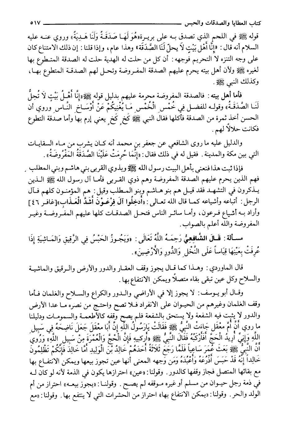 فَإِذَا ثَبَتَ هَذَا فَنَعْنِي بِأَهْلِ الْبَيْتِ رَسُولَ اللَّهِ - صَلَّى اللَّهُ عَلَيْهِ وَسَلَّم َ - وَبِذَوِي الْقُرْبَى بَنِي هَاشِمٍ وَبَنِي الْمُطَّلِبِ فَهُمُ الَّذِينَ يَحْرُمُ عَلَيْهِمِ الصَّدَقَةُ الْمَفْرُوضَةُ وَهُمْ ذَوِي الْقُرْبَى فَأَمَّا آلُ رَسُولِ اللَّهِ - صَلَّى اللَّهُ عَلَيْهِ وَسَلَّم َ - الَّذِينَ يُذْكَرُونَ فِي التَّشَهُّدِ فَقَدْ قِيلَ هُمْ بَنُو هَاشِمٍ وَبَنُو الْمُطَّلِبِ وَقِيلَ: هُمُ الْمُؤْمِنُونَ كُلُّهُمْ فَآلُ الرَّجُلِ: أَتْبَاعُهُ وَأَشْيَاعُهُ كَمَا قَالَ اللَّهُ تَعَالَى: {أَدخِلُوا آلَ فِرْعَوْنَ أَشَدَّ العَذَابِ) {غافر: 46) وَأَرَادَ بِهِ أَشْيَاعَ فِرْعَوْنَ، وَأَمَّا سَائِرُ النَّاسِ فَتَحِلُّ الصَّدَقَاتُ كُلُّهَا عَلَيْهِمِ الْمَفْرُوضَةُ وَغَيْرُ المفروضة والله أعلم بالصواب.