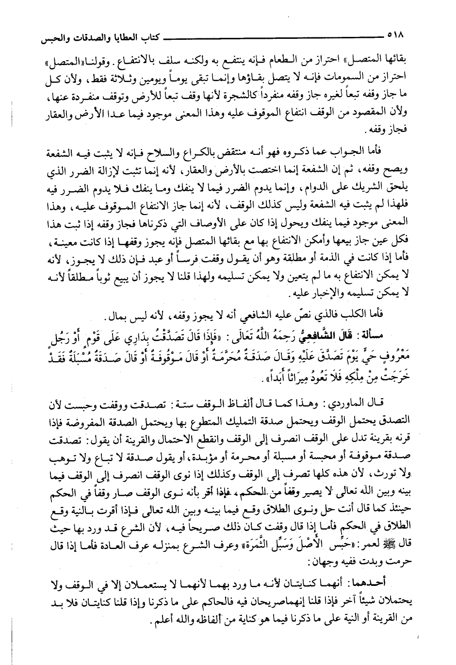 فَأَمَّا الْجَوَابُ عَمَّا ذَكَرُوهُ فَهُوَ أَنَّهُ مُنْتَقَضٌ بِالْكُرَاعِ وَالسِّلَاحِ فَإِنَّهُ لَا يَثْبُتُ فِيهِ الشُّفْعَةُ وَيَصِحُّ وَقْفُهُ، ثُمَّ إِنَّ الشُّفْعَةَ إِنَّمَا اخْتَصَّتْ بِالْأَرْضِ وَالْعَقَارِ، لِأَنَّهُ إِنَّمَا تَثَبَّتَ لِإِزَالَةِ الضَّرَرِ الَّذِي يَلْحَقُ الشَّرِيكَ عَلَى الدَّوَامِ، وَإِنَّمَا يَدُومُ الضَّرَرُ فِيمَا لَا يَنْفَكُّ وَمَا يَنْفَكُّ فَلَا يَدُومُ الضَّرَرُ فِيهِ فَلِهَذَا لَمْ يَثْبُتْ فِيهِ الشُّفْعَةُ وَلَيْسَ كَذَلِكَ الْوَقْفُ، لِأَنَّهُ إِنَّمَا جَازَ الِانْتِفَاعُ الْمَوْقُوفُ عَلَيْهِ، وَهَذَا الْمَعْنَى مَوْجُودٌ فِيمَا يَنْفَكُّ وَيُحَوَّلُ إِذَا كَانَ عَلَى الْأَوْصَافِ الَّتِي ذَكَرْنَاهَا فَجَازَ وَقْفُهُ إذا ثَبَتَ هَذَا فَكُلُّ عَيْنٍ جَازَ بَيْعُهَا وَأَمْكَنَ الِانْتِفَاعُ بِهَا مَعَ بَقَائِهَا الْمُتَّصِلِ فَإِنَّهُ يَجُوزُ وَقْفُهَا إِذَا كَانَتْ مُعَيَّنَةً، فَأَمَّا إِذَا كَانَتْ فِي الذِّمَّةِ أَوْ مُطْلَقَةً وَهُوَ أَنْ يَقُولَ وقفت فرساً أو عبد فَإِنَّ ذَلِكَ لَا يَجُوزُ، لِأَنَّهُ لَا يُمْكِنُ الِانْتِفَاعُ بِهِ مَا لَمْ يَتَعَيَّنْ وَلَا يُمْكِنُ تَسْلِيمُهُ وَلِهَذَا قُلْنَا لَا يَجُوزُ أَنْ يَبِيعَ ثَوْبًا مُطْلَقًا لِأَنَّهُ لَا يُمْكِنُ تَسْلِيمُهُ وَالْإِخْبَارُ عَلَيْهِ.