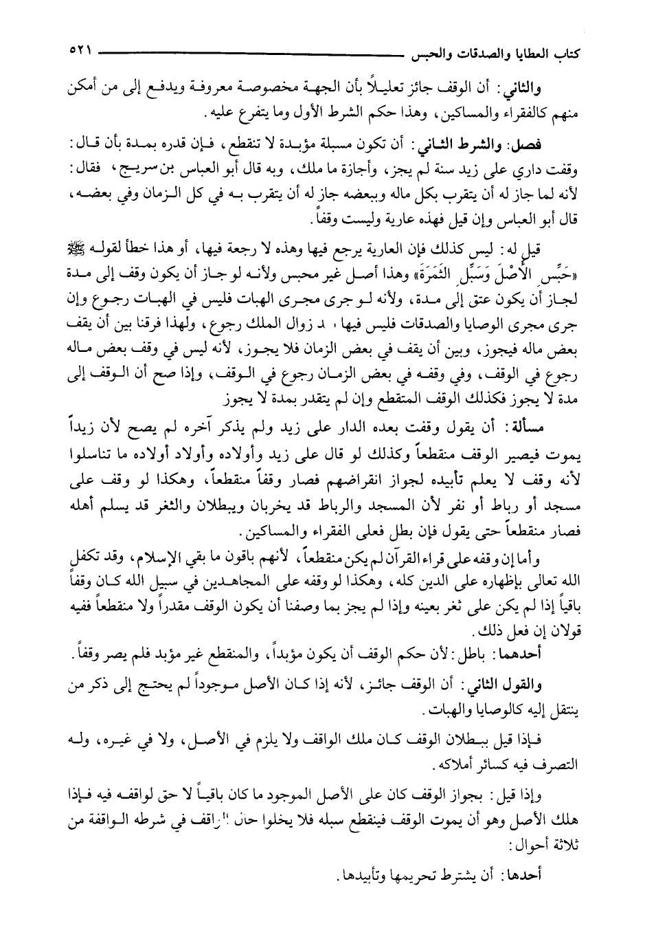 : وَالشَّرْطُ الثَّانِي: أَنْ تَكُونَ مُسْبَلَةً مُؤَبَّدَةً لَا تَنْقَطِعُ، فَإِنْ قَدَّرَهُ بِمُدَّةٍ بِأَنْ قَالَ: وَقَفُتُ دَارِي عَلَى زَيْدٍ سَنَةً لم يجز، وأجازه ما ملك، وَبِهِ قَالَ أَبُو الْعَبَّاسِ بْنُ سُرَيْجٍ، فَقَالَ: لِأَنَّهُ لَمَّا جَازَ لَهُ أَنْ يَتَقَرَّبَ بِكُلِّ مَالِهِ وَبِبَعْضِهِ جَازَ لَهُ أَنْ يَتَقَرَّبَ بِهِ فِي كُلِّ الزَّمَانِ وَفِي بَعْضِهِ، قَالَ أَبُو الْعَبَّاسِ وَإِنْ قِيلَ فَهَذِهِ عَارِيَةٌ وَلَيْسَتْ وَقْفًا.