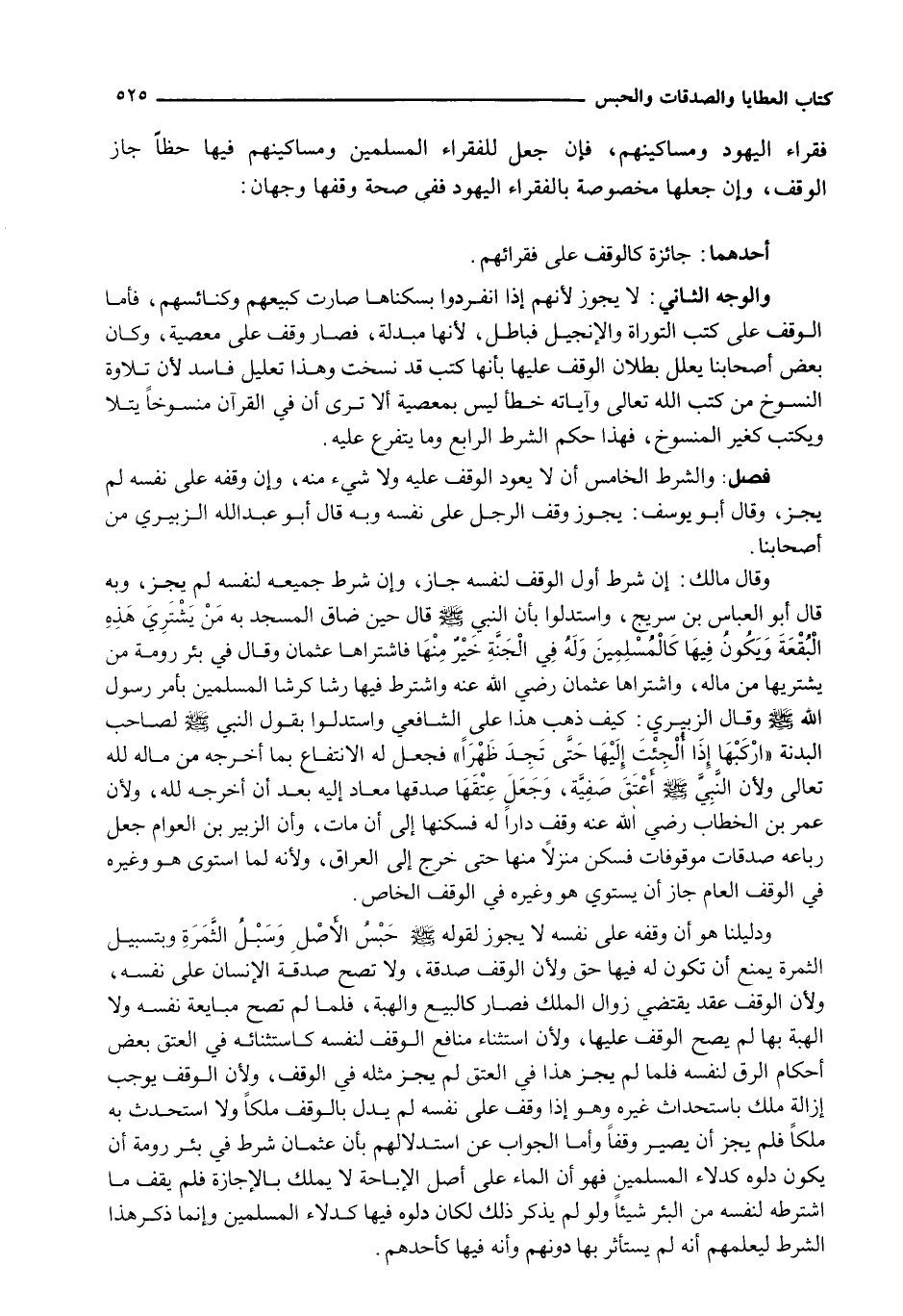 : وَالشَّرْطُ الْخَامِسُ أَنْ لَا يَعُودَ الْوَقْفُ عَلَيْهِ وَلَا شَيْءَ مِنْهُ، وَإِنْ وَقَفَهُ عَلَى نَفْسِهِ لَمْ يَجُزْ، وَقَالَ أبو يوسف: يَجُوزُ وَقْفُ الرَّجُلِ عَلَى نَفْسِهِ وَبِهِ قَالَ أَبُو عَبْدِ اللَّهِ الزُّبَيْرِيُّ مِنْ أَصْحَابِنَا.