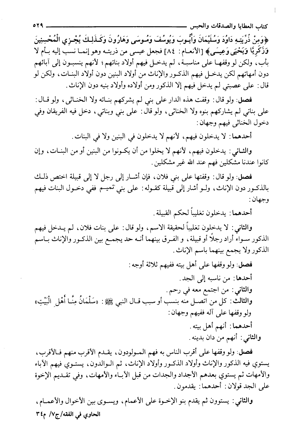 {وَمِنْ ذُرِّيَتِهِ دَاوُدَ وَسُلَيْمَانَ وَأَيُّوبَ وَيُوسُفَ وَمُوسَى وَهَارُونَ وَكَذَلِكَ يُجْزِي الْمُحْسِنِينَ وَزَكَرِيَّا وَيَحْيَى وَعِيسَى) {الأنعام: 84) فَجَعَلَ عِيسَى مِنْ ذُرِّيَّتِهِ وَهُوَ إِنَّمَا نَسَبَ إِلَيْهِ بِأُمٍّ لَا بِأَبٍ، وَلَكِنْ لَوْ وَقَفَهَا عَلَى مُنَاسَبَةٍ، لَمْ يَدْخُلْ فِيهِمْ أَوْلَادُ بَنَاتِهِمْ، لِأَنَّهُمْ يُنْسَبُونَ إِلَى آبَائِهِمْ دُونَ أُمَّهَاتِهِمْ لَكِنْ يَدْخُلُ فِيهِمِ الذُّكُورُ وَالْإِنَاثُ مِنْ أَوْلَادِ الْبَنِينَ دُونَ أَوْلَادِ الْبَنَاتِ، وَلَكِنْ لَوْ قَالَ: عَلَى عَصَبَتِي لَمْ يَدْخُلْ فِيهِمْ إِلَّا الذُّكُورُ وَمِنْ أَوْلَادِهِ وَأَوْلَادِ بَنِيهِ دُونَ الْإِنَاثِ.