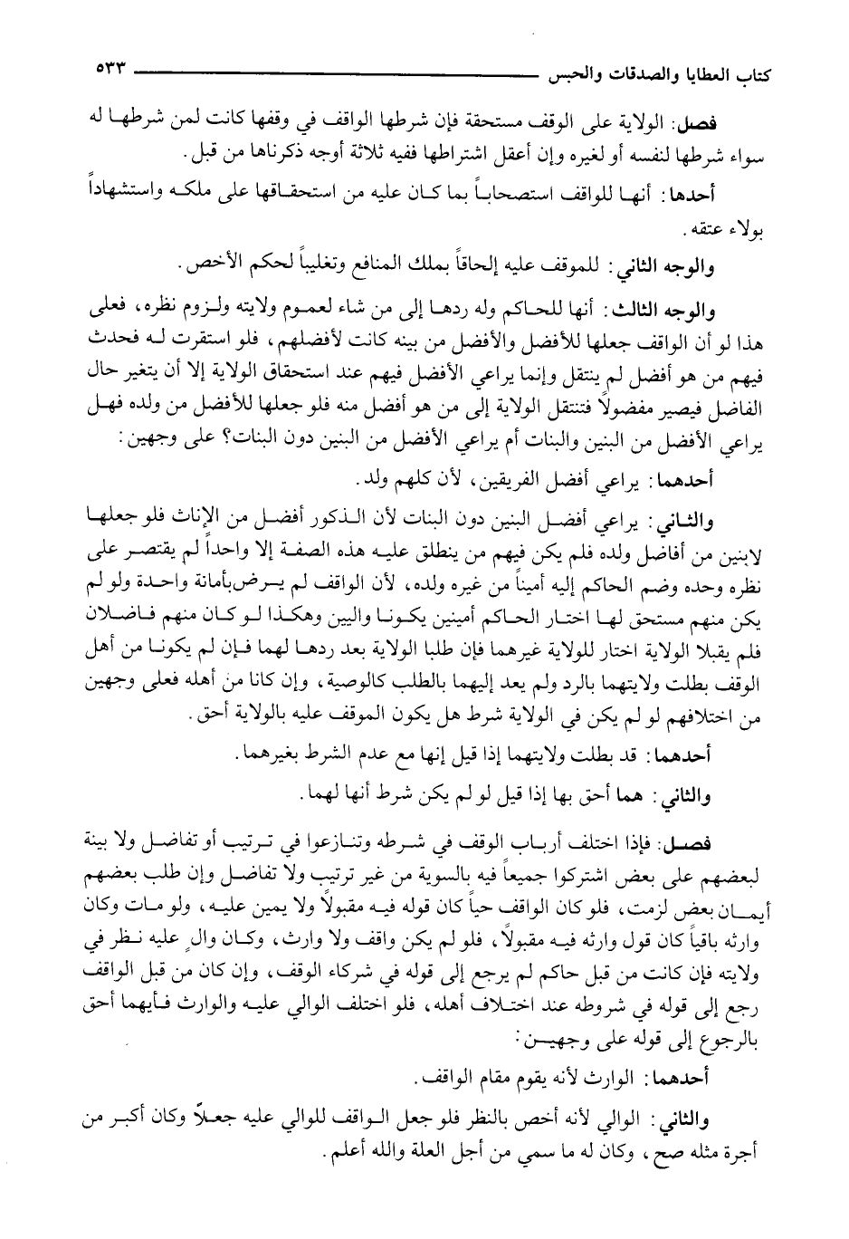 وَالْوَجْهُ الثَّالِثُ: أَنَّهَا لِلْحَاكِمِ وَلَهُ رَدُّهَا إِلَى مَنْ شَاءَ لِعُمُومِ وِلَايَتِهِ وَلُزُومِ نَظَرِهِ، فَعَلَى هَذَا لَوْ أَنَّ الْوَاقِفَ جعلها للأفضل والأفضل من بينه كَانَتْ لِأَفْضَلِهِمْ، فَلَوِ اسْتَقَرَّتْ لَهُ فَحَدَثَ فِيهِمْ مَنْ هُوَ أَفْضَلُ لَمْ يَنْتَقِلْ وَإِنَّمَا يُرَاعَى الْأَفْضَلُ فِيهِمْ عِنْدَ اسْتِحْقَاقِ الْوِلَايَةِ إِلَّا أَنْ يَتَغَيَّرَ حَالُ الْفَاضِلِ فَيَصِيرَ مَفْضُولًا فَتَنْتَقِلُ الْوِلَايَةُ إِلَى مَنْ هُوَ أَفْضَلُ مِنْهُ فَلَوْ جَعَلَهَا لِلْأَفْضَلِ مِنْ وَلَدِهِ فَهَلْ يُرَاعَى الْأَفْضَلُ مِنَ الْبَنِينَ وَالْبَنَاتِ أَمْ يُرَاعَى الْأَفْضَلُ مِنَ الْبَنِينَ دُونَ الْبَنَاتِ؟ عَلَى وَجْهَيْنِ: