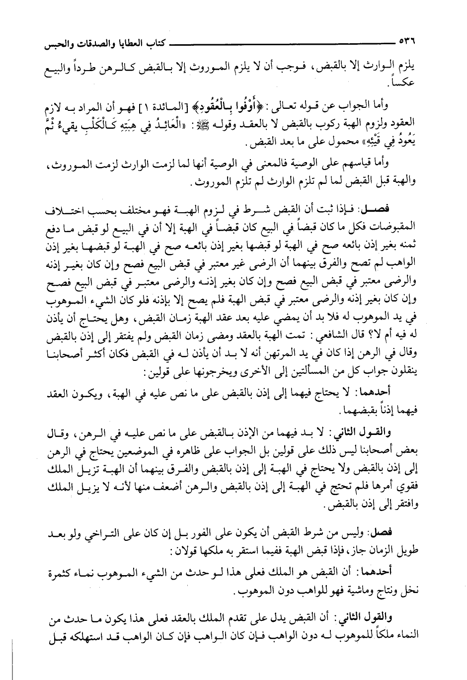 وَأَمَّا الْجَوَابُ عَنْ قَوْله تَعَالَى: {أَوْفُوا بِالْعُقُودِ) {المائدة: 1) فَهُوَ أَنَّ الْمُرَادَ بِهِ لَازِمُ الْعُقُودِ وَلُزُومُ الْهِبَةِ رُكُوبٌ بِالْقَبْضِ لَا بِالْعَقْدِ وقوله - صَلَّى اللَّهُ عَلَيْهِ وَسَلَّم َ -: " الْعَائِدُ فِي هِبَتِهِ كَالْكَلْبِ يَقِيءُ ثُمَّ يَعُودُ فِي قَيْئِهِ " مَحْمُولٌ عَلَى مَا بَعْدَ الْقَبْضِ.
