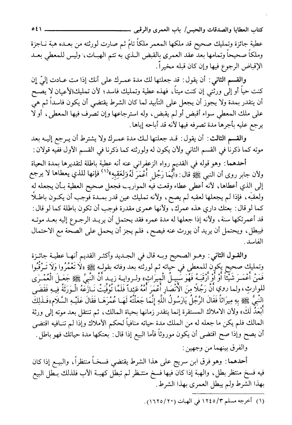 وَالْقِسْمُ الثَّانِي: أَنْ يَقُولَ: قَدْ جَعَلْتُهَا لَكَ مُدَّةَ عُمْرِكَ عَلَى أَنَّكَ إِذَا مِتَّ عَادَتْ إِلَيَّ إِنْ كُنْتُ حَيًّا أَوْ إِلَى وَرَثَتِي إِنْ كُنْتُ مَيِّتًا، فَهَذِهِ عَطِيَّةٌ وَتَمْلِيكٌ فَاسِدٌ؛ لِأَنَّ تَمْلِيكَ الْأَعْيَانِ لَا يَصِحُّ أَنْ يَتَقَدَّرَ بِمُدَّةٍ وَلَا يَجُوزُ أَنْ يُجْعَلَ عَلَى التَّأْبِيدِ لَمَّا كَانَ الشَّرْطُ يَقْتَضِي أَنْ يَكُونَ فَاسِدًا ثُمَّ هِيَ عَلَى مِلْكِ الْمُعْطِي سَوَاءٌ أَقَبْضَ أَوْ لَمْ يَقْبِضْ، وَلَهُ اسْتِرْجَاعُهَا وَإِنْ تَصَرَّفَ فِيهَا الْمُعْطَى، أَوْ لَا يَرْجِعُ عَلَيْهِ بِأَجْرِهَا مُدَّةَ تَصَرُّفِهِ فِيهَا لِأَنَّهُ قَدْ أَبَاحَهُ إِيَّاهَا.